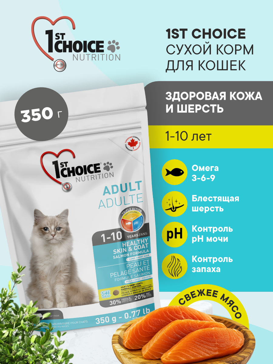 1st Choice Здоровая кожа и шерсть HEALTHY SKIN & COAT — формула разработана для улучшения состояния кожи и шерсти в любое время года, шерсть любой длины становится мягкой и блестящей. Рыба и рыбий жир содержат все необходимое для здоровой кожи и блестящей шерсти.