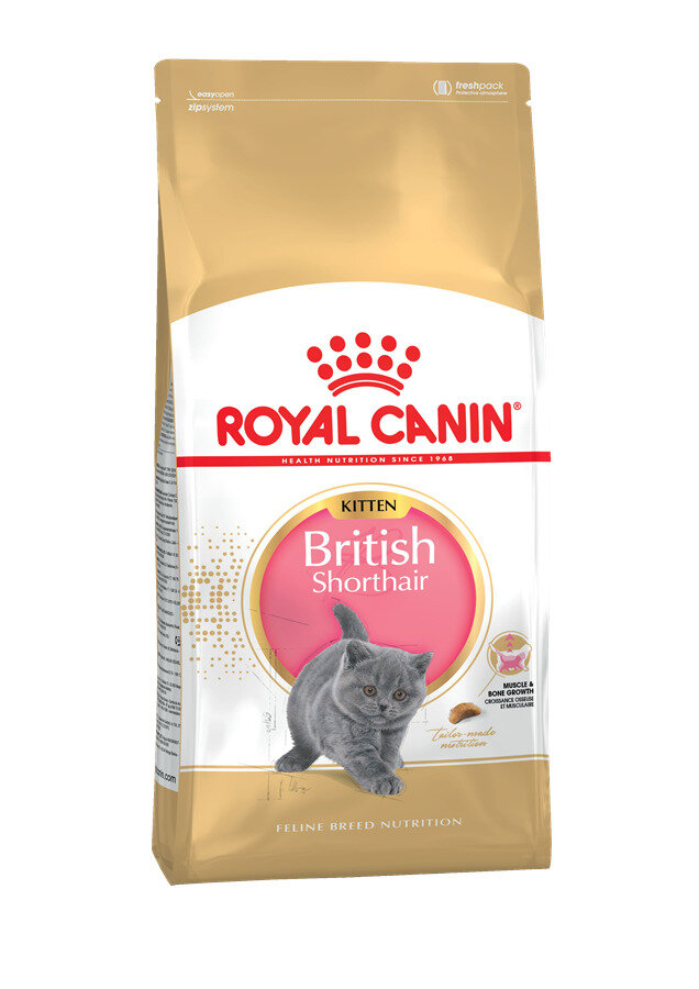 Корм сухой полнорационный для котят породы британская короткошерстная и шотландская вислоухая в возрасте от 4 до 12 месяцев KITTEN BRITISH SHORTHAIR (киттен бритиш шортхэйр) ROYAL CANIN, подходящий для котят породы британская короткошерстная и шотландская вислоухая в возрасте от 4 до 12 месяцев, специально разработан с учетом потребностей вашего котенка в питательных веществах Формула сухого продукта ROYAL CANIN Kitten British Shorthair (киттен бритиш шортхэйр) поддерживает иммунитет, здоровое пищеварение, а также формирование мышц, костей и суставов. Содержащиеся в рационе пребиотики (ФОС и МОС), высококачественные белки L.I.P.*, семена подорожника и клиноптилолит осадочного происхождения поддерживают оптимальное пищеварение. Поскольку иммунная система вашего котенка развивается постепенно, корм ROYAL CANIN Kitten British Shorthair (киттен бритиш шортхэйр) содержит эффективный комплекс антиоксидантов для поддержания иммунитета котят. Формула ROYAL CANIN Kitten British Shorthair (киттен бритиш шортхэйр) также поддерживает здоровье костей и суставов благодаря адаптированному содержанию минеральных веществ, хондропротекторам (глюкозамину и хондроитину). Размер и текстура гранул в форме полумесяца ROYAL CANIN Kitten British Shorthair (киттен бритиш шортхэйр) разработаны специально для удобства захвата британскими короткошерстными котятами.