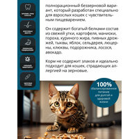 Корм не содержит злаков и идеально подходит для кошек, страдающих аллергией на зерновые.