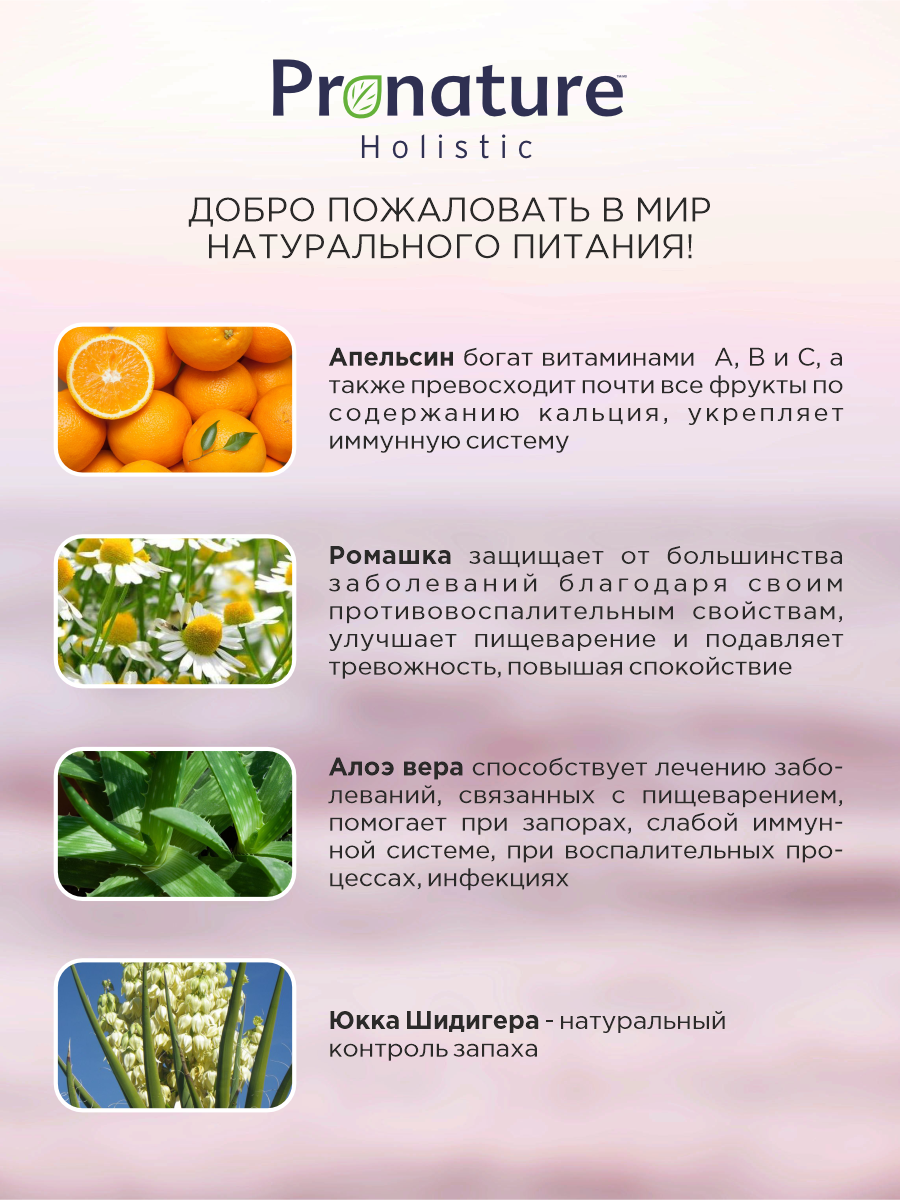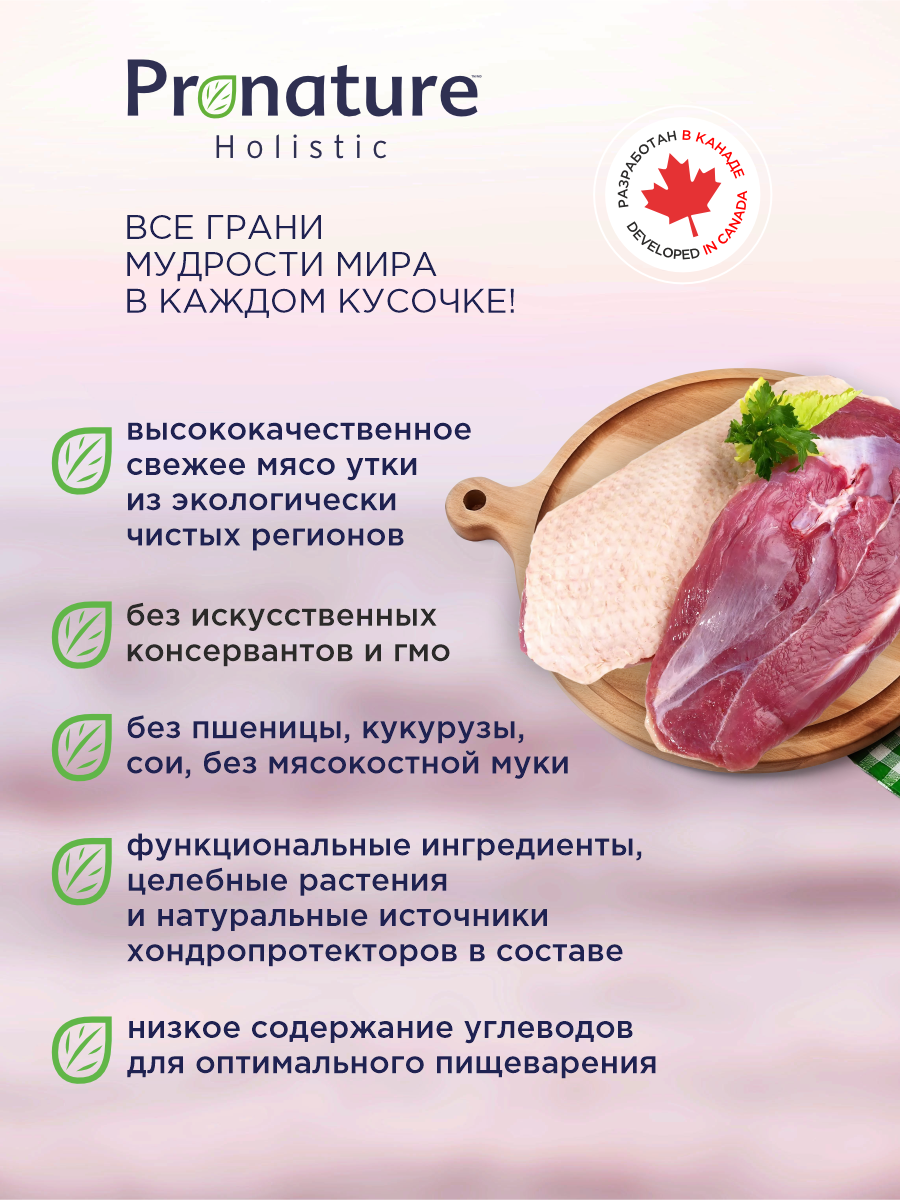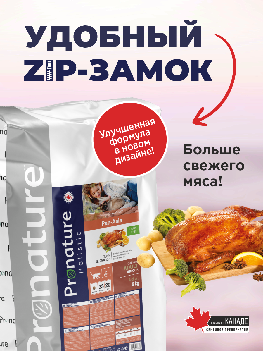 Добро пожаловать в мир натурального питания! Сухой корм для кошек, разработанный в Канаде, Pronature Holistic Pan-Asia Grain Free (Пронатюр Холистик Пан Азия) на свежем филе утки – это оптимальное решение для заботливых владельцев, стремящихся дать своему пушистому другу лучшее сбалансированное питание. Утка с картофелем и апельсином, яблоками и ананасом – удивительный баланс между солёным, сладким, кислым и пряными ароматами трав приведет в восторг любого питомца! Корм укрепляет здоровье и иммунную систему вашего питомца, может помочь предотвратить некоторые хронические заболевания. Главный ингредиент этой монопротеиновой беззерновой сбалансированной по питательным веществам и очень вкусной формулы - высококачественное свежее мясо утки, которое славится своими диетическими показателями и высоким содержанием белка. Апельсин богат витаминами А, В и С, а также превосходит почти все фрукты по содержанию кальция, укрепляет иммунную систему. Ромашка защищает от большинства заболеваний благодаря своим противовоспалительным свойствам, улучшает пищеварение и подавляет тревожность, повышая спокойствие. Алоэ вера способствует лечению заболеваний, связанных с пищеварением, помогает при запорах, слабой иммунной системе, при воспалительных процессах, инфекциях, некоторых видах раковых заболеваний, также алоэ вера снижает уровень глюкозы в крови, отчего является полезной в случаях заболевания диабетом. Юкка Шидигера - натуральный контроль запаха. Этот натуральный корм не содержит искусственных консервантов и ГМО, а также не содержит пшеницу, кукурузу, сою и мясокостную муку. Благодаря такому составу данный рацион способствует поддержанию здорового пищеварения и общего состояния здоровья кошки. Кроме того, в рецептуре используются функциональные ингредиенты: целебные растения и натуральные источники хондропротекторов. Все это помогает укрепить кошачьи суставы и поддерживать их активность в течение долгого времени. Низкое содержание углеводов способствует оптимальному пищеварению и поддержанию нормального веса питомца. Сделайте выбор в пользу здоровья вашей кошки или кота, используя Pronature Holistic – лучший корм для счастья вашего любимца! Ваш питомец заслуживает только самое лучшее. ВСЕ грани мудрости мира В каждом кусочке!
