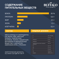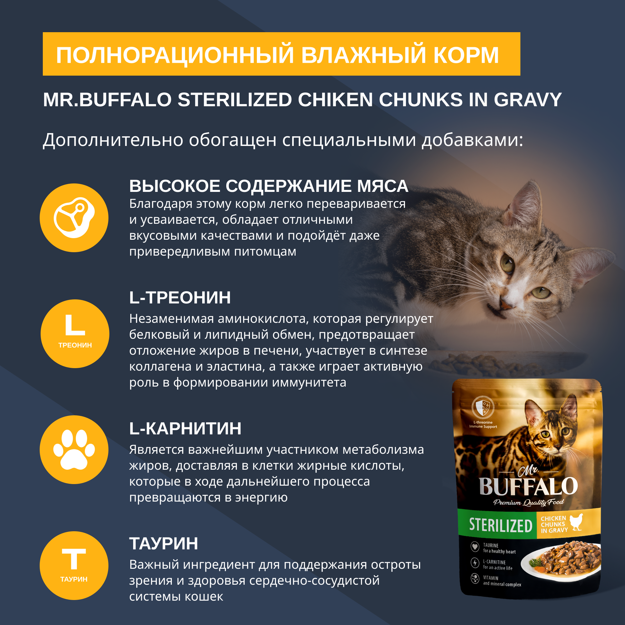 - Влажный корм премиум-класса с цыпленком для взрослых стерилизованных котов и кошек «Цыпленок» в соусе Mr.Buffalo for sterilized cats «Chicken» in gravy изготовлен из натуральных, гипоаллергенных и легко усваиваемых ингредиентов. В оптимальном количестве содержит животные белки и жиры, питательные вещества, а также микроэлементы, необходимые для жизнедеятельности вашей кошки. Благодаря сбалансированному составу поддерживает работу желудочно-кишечного тракта, иммунитета, а также других органов и систем организма. Рацион разработан на основе исследований в области питания домашних животных, учитывающих особенности организма стерилизованной кошки, изготовлен специально для того, чтобы помочь животному чувствовать себя здоровым и активным. L-треонин в составе корма — незаменимая аминокислота, которая предотвращает отложение жиров в печени, участвует в синтезе коллагена и эластина (структурных белков, составляющих основу соединительной ткани, обеспечивающих ее прочность и эластичность), а также играет активную роль в формировании иммунитета. Вместе с тем у взрослых кошек недостаток этой аминокислоты вызывает нарушение обмена веществ, снижение массы тела и сбои в работе печени. L-карнитин в составе рациона является важнейшим участником метаболизма жиров, доставляя в клетки жирные кислоты, которые в ходе дальнейшего процесса превращаются в энергию. Таурин — важный ингредиент для поддержания остроты зрения и здоровья сердечно-сосудистой системы кошек. Влажный корм Mr. Buffalo не содержит сахара, ГМО, сои. Паучи отлично дополнят полнорационный сухой корм Mr. Buffalo и внесут разнообразие в питание вашей кошки.