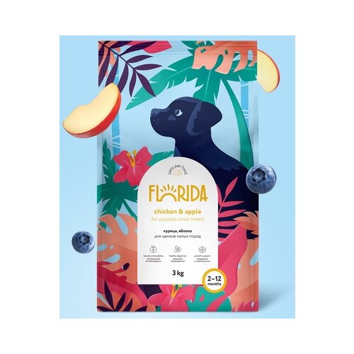 Florida Chicken and Apple - сухой корм супер-премиум-класса с курицей и яблоком для щенков малых пород с 2 до 12 месяцев. Сбалансированное полнорационное питание, способствующее гармоничному развитию щенка. В рационе кормов Florida используется только белок животного происхождения.