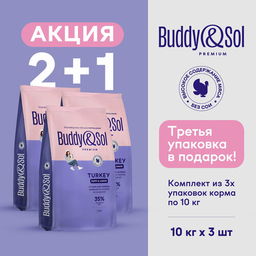 Корм для щенков и молодых собак всех пород Buddy&Sol премиум-класса с индейкой, 3 упаковки по 10 кг