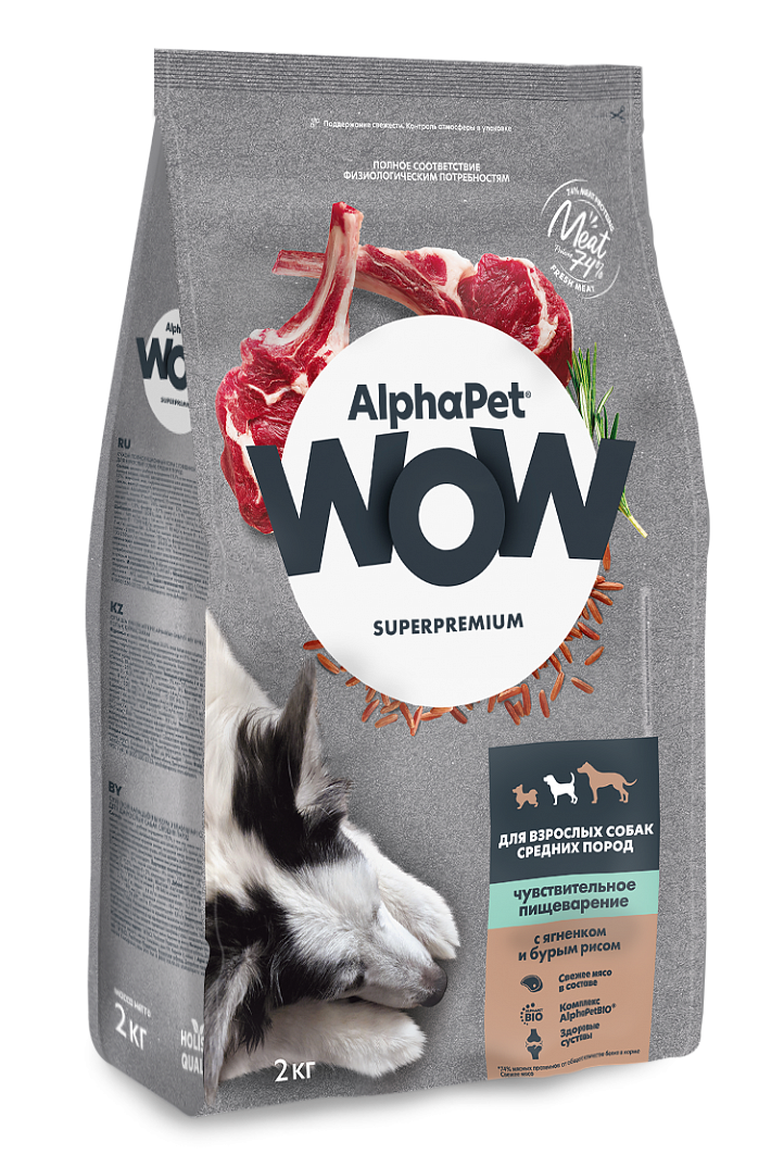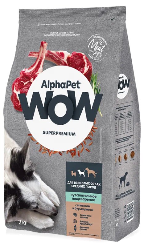 Купить AlphaPet WOW Superpremium сухой полнорационный корм для взрослых собак средних пород с чувствительным пищеварением с ягненком и бурым рисом — 2 кг с доставкой по всей России.