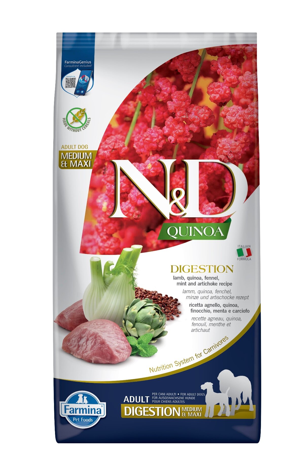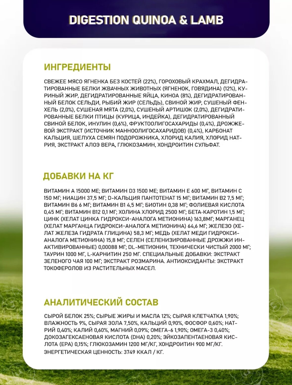 Ягненок, киноа, фенхель, мята и артишок. Поддержка пищеварения. Полнорационный сухой корм для взрослых собак.