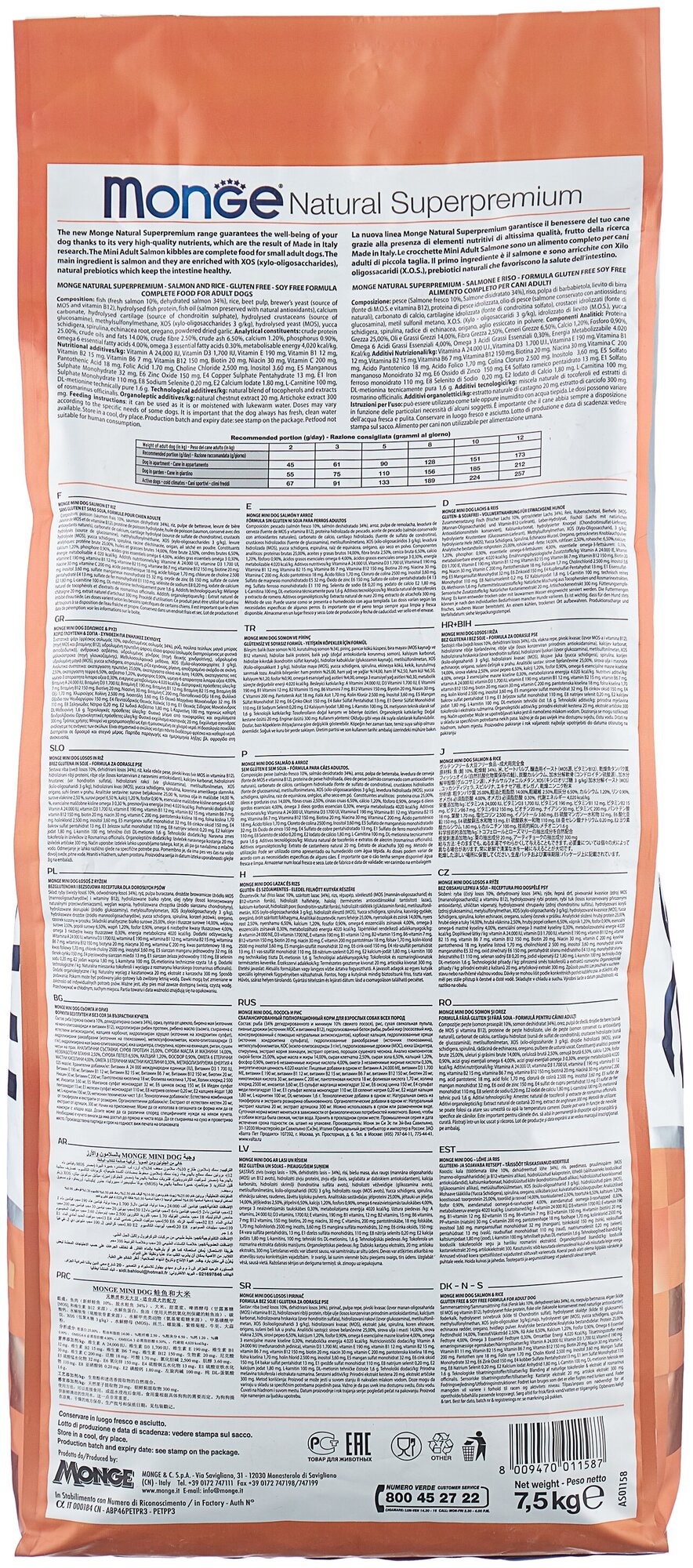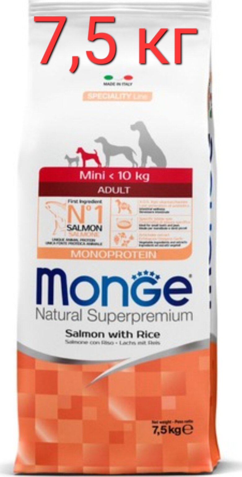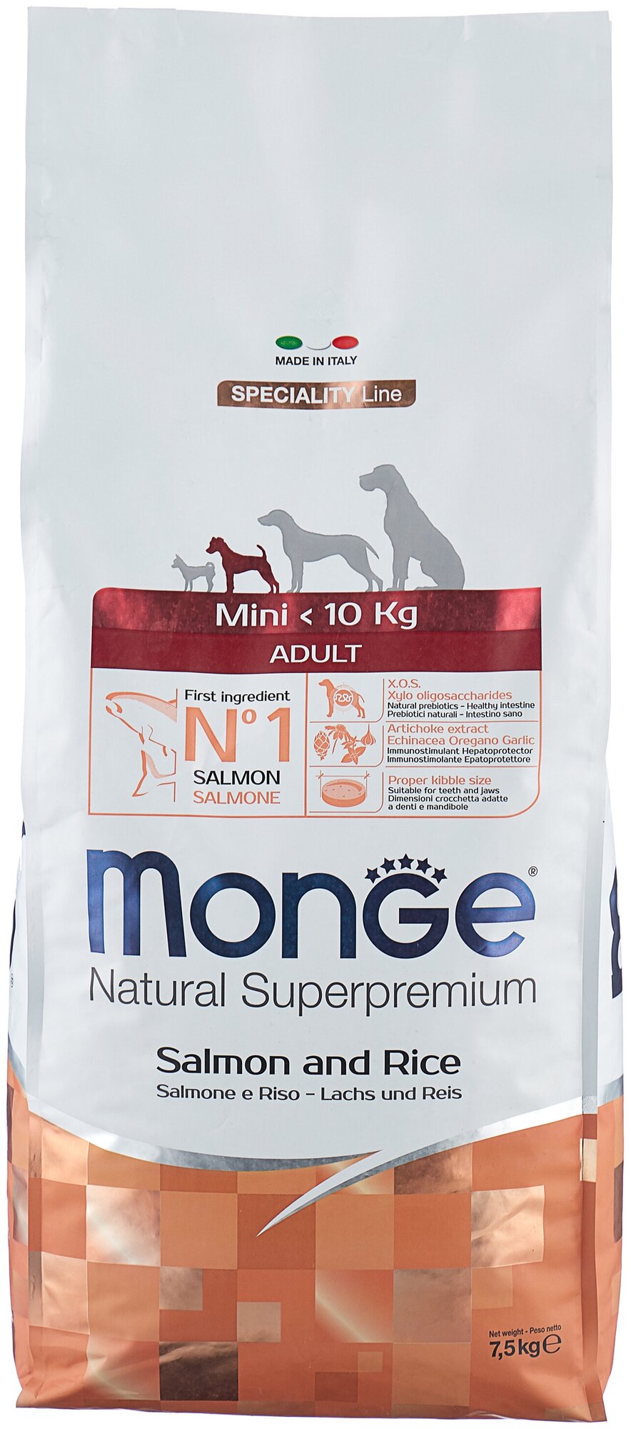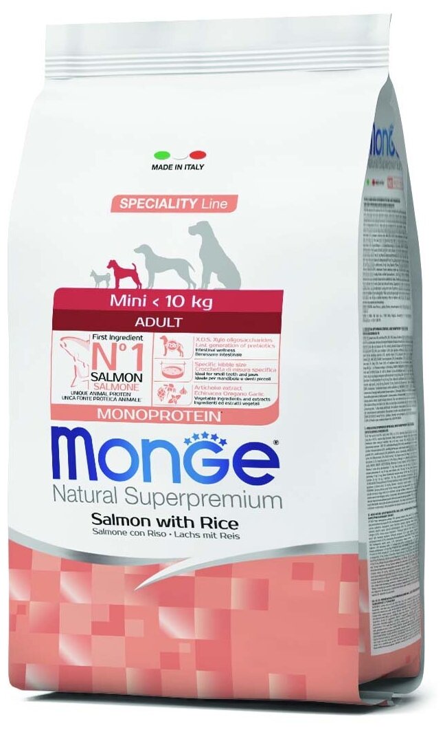 MONGE SPECIALITY LINE MINI ADULT SALMONE AND RICE - это полноценный сбалансированный рацион для взрослых собак мелких пород с особыми потребностями. Богат омега-3 и омега-6 жирными кислотами, которые позволяют предупредить воспалительные процессы и сохранить здоровье кожи и блеск шерсти вашего питомца.