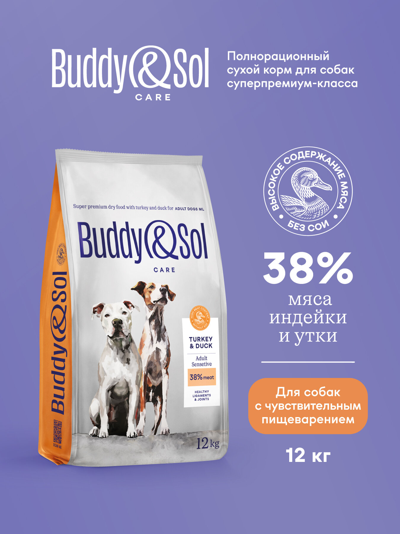 Корм для собак средних и крупных пород с чувствительным пищеварением Buddy&Sol 12 кг сухой суперпремиум-класса с индейкой и уткой