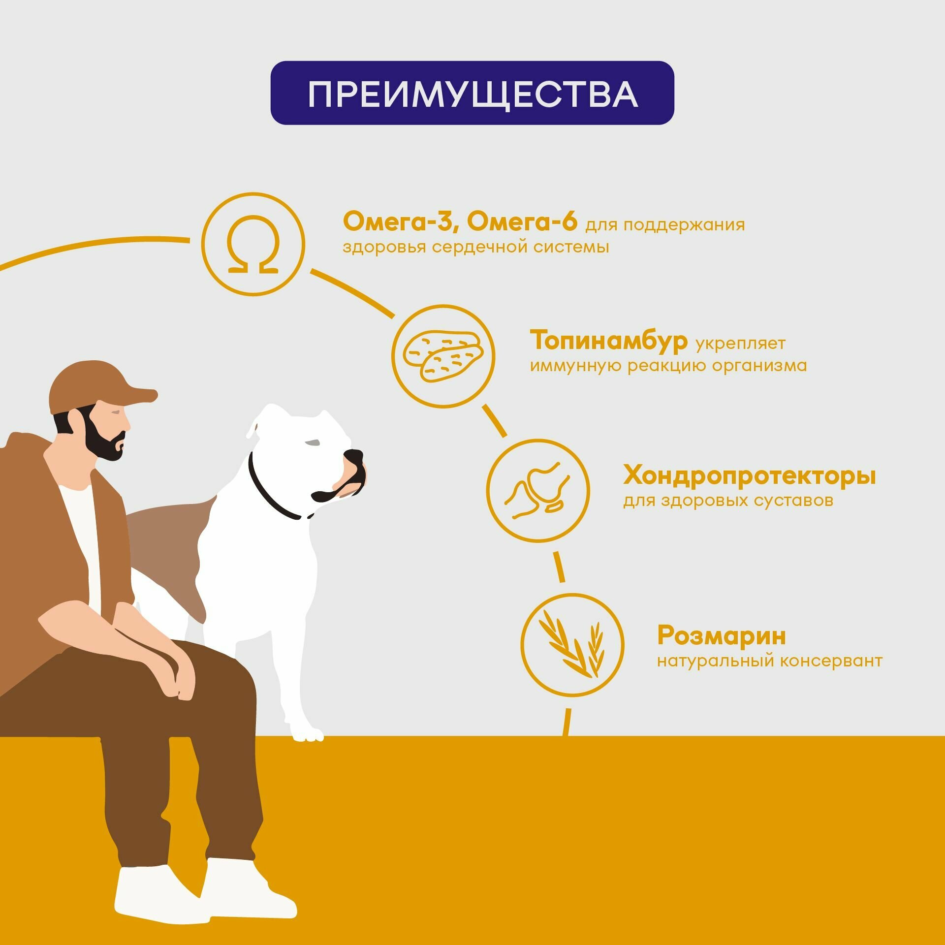 Топинамбур укрепляет иммунную реакцию организма, а ОМЕГА-3 и ОМЕГА-6 поддерживают здоровье сердечной системы. Хондропротекторы заботятся о здоровье суставов, а натуральный консервант розмарин обеспечивает сохранность корма.