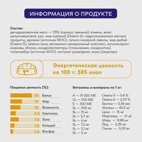 Корм обогащен витаминами и минералами, включая витамины А, D3, E, B4, B3, B1, B2, B6, B9, биотин, железо, цинк, марганец, медь, йод и селен. Энергетическая ценность составляет 385 ккал на 100 г корма.