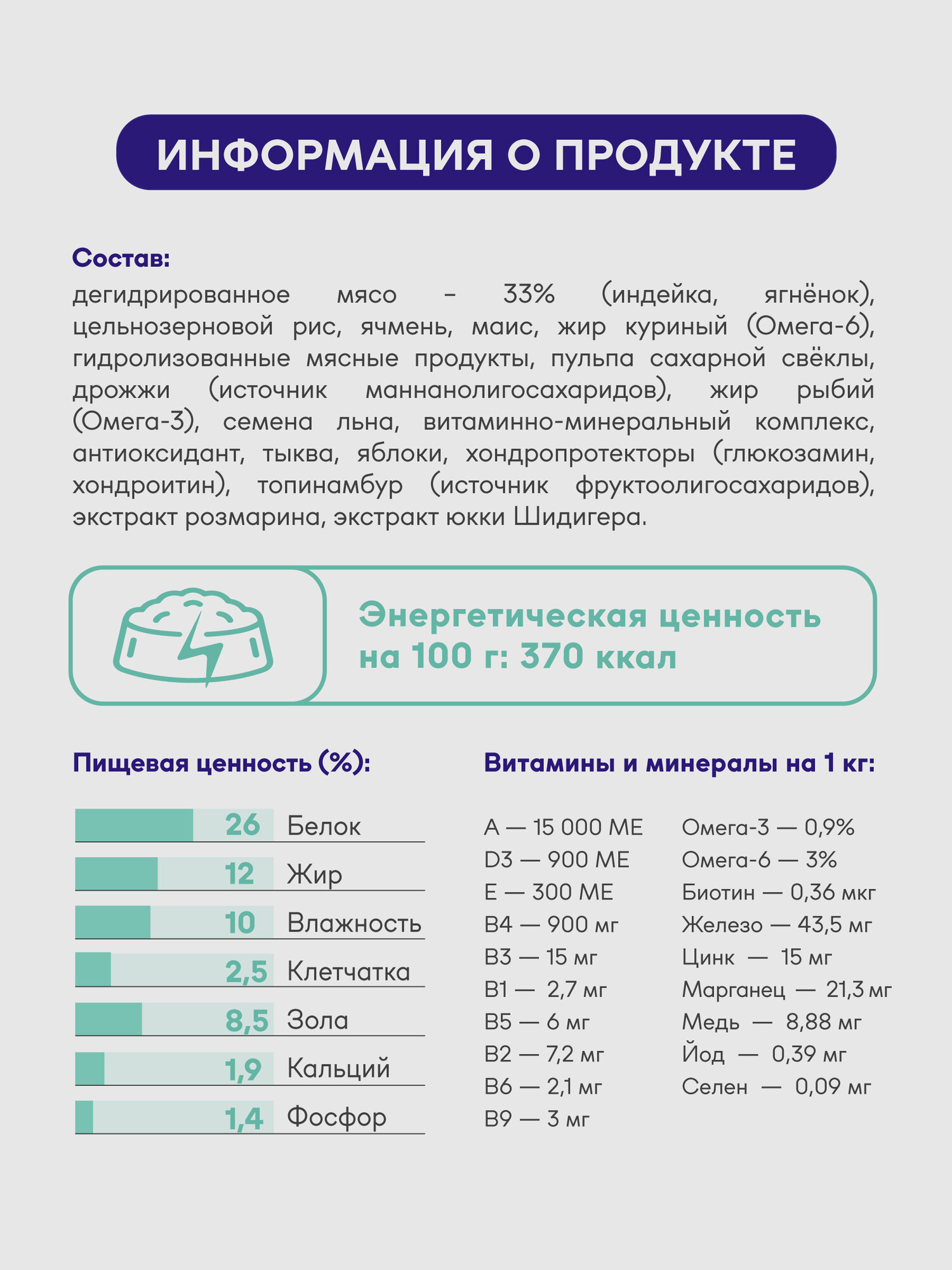 | Особые потребности | гипоаллергенный, для активных животных, для беременных/кормящих, для здоровья кожи и блеска шерсти, для здоровья костей и суставов, при чувствительном пищеварении |