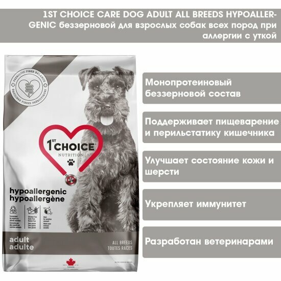 Корм сухой гипоаллергенный для собак 1ST Choice Hypoallergenic с уткой 2кг: сравнение цен, характеристики, фото, актуальное наличие и цены.