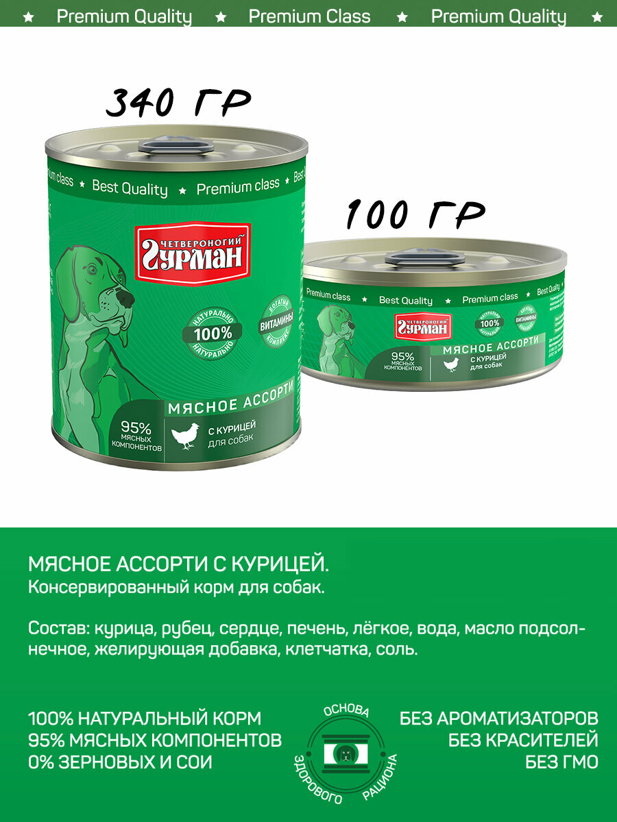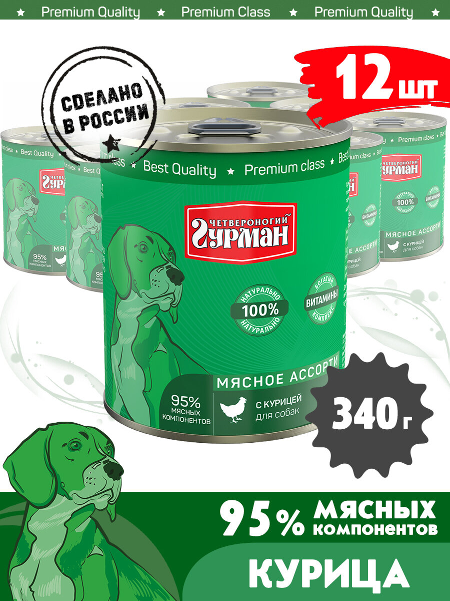 Корм для собак влажный, Четвероногий Гурман «Мясное ассорти» с курицей, 340 г х 12 шт.: сравнение цен, характеристики, фото, актуальное наличие и цены.