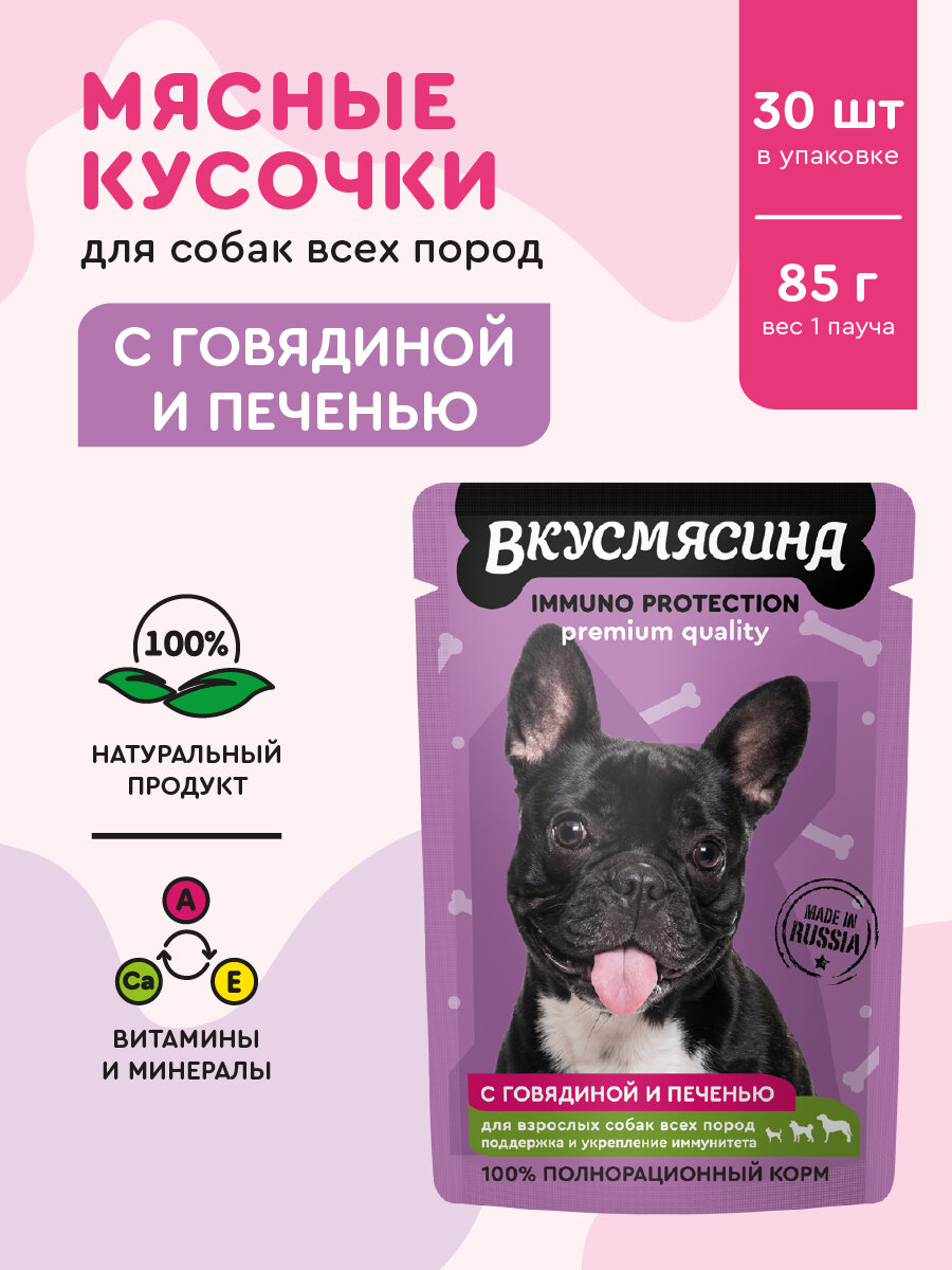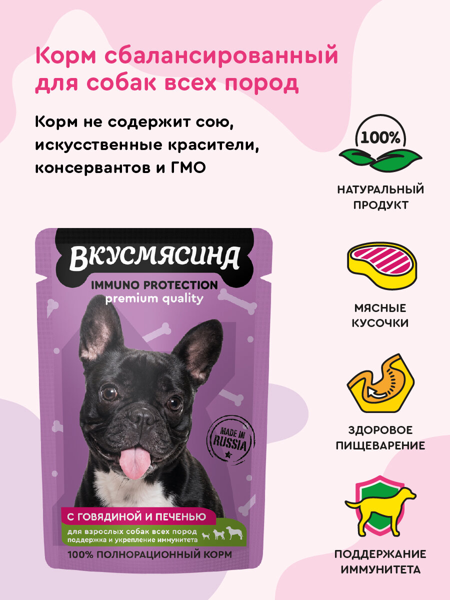 Ищете качественный корм для собак , который будет не только вкусным, но и полезным? Представляем вам влажный корм для собак премиум-класса от бренда вкусмясина. Этот продукт создан специально для собак в возрасте от 1 до 6 лет всех пород, включая мелкие породы. Благодаря высокому содержанию натуральной говядины и печени (не менее 4% каждого ингредиента), этот корм для собак мелких пород обеспечивает оптимальный баланс белков, жиров и углеводов, сохраняя при этом непревзойденный вкус.