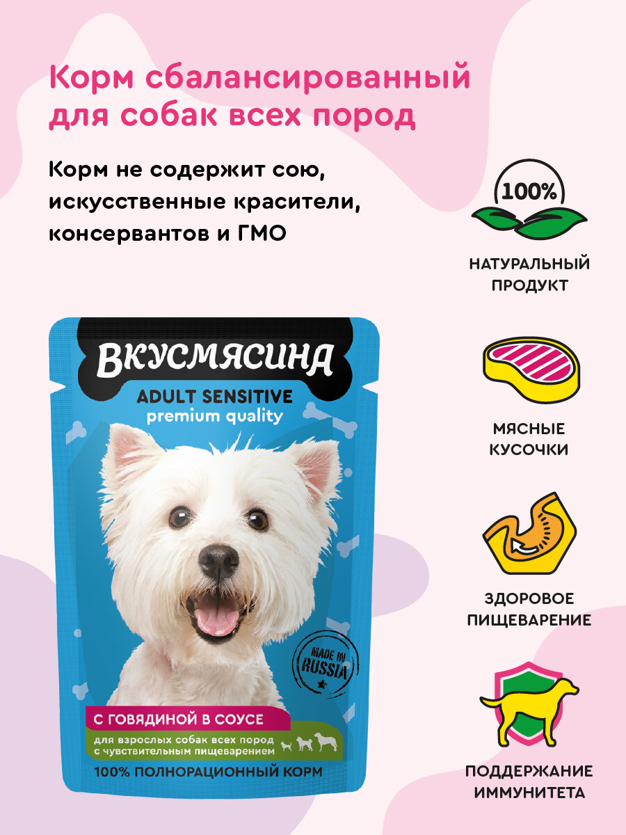 Ищете качественный корм для собак , который будет не только вкусным, но и полезным? Представляем вам влажный корм для собак премиум-класса от бренда вкусмясина. Этот продукт создан специально для собак в возрасте от 1 до 6 лет всех пород, включая мелкие породы. Благодаря высокому содержанию натуральной говядины (не менее 4%), этот корм для собак мелких пород обеспечивает оптимальный баланс белков, жиров и углеводов, сохраняя при этом непревзойденный вкус.