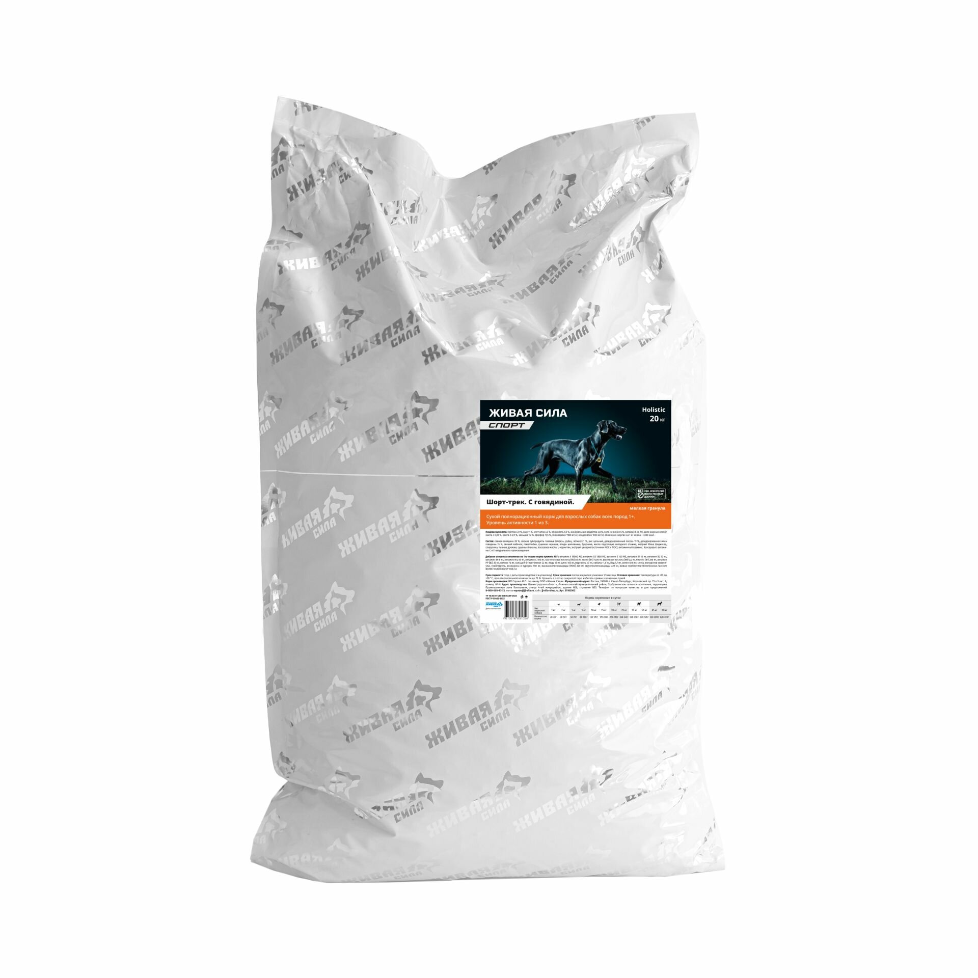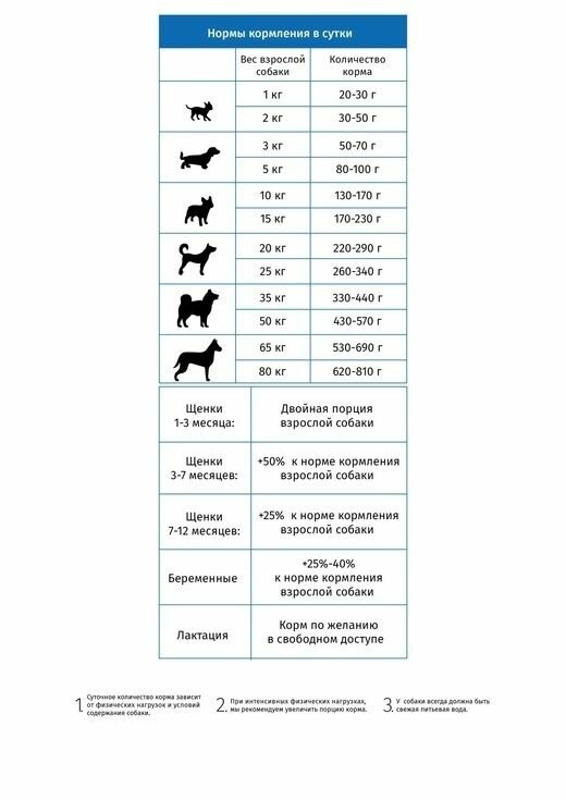 Пищевая ценность: протеин 28 %, жир 16 %, клетчатка 3,2 %, влажность 9,5 %, минеральные вещества 3,8 %, зола не менее 6 %, витамин Е 50 МЕ, доля жирных кислот омега-3 0,93 %, омега-6 2,9 %, кальций 1,2 %, фосфор 1,15 %, глюкозамин 1180 мг/кг, хондроитин 1050 мг/кг, обменная энергия на 1 кг корма – 3600 Ккал