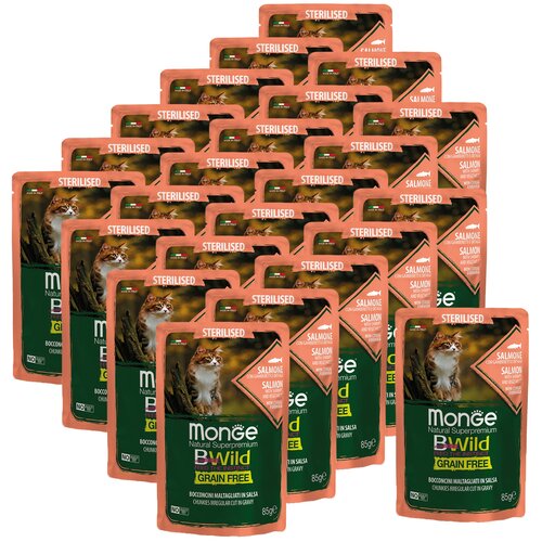 Купить Корм для стерилизованных кошек Monge BWILD Feed the Instinct, беззерновой, с лососем, с креветками, с овощами 24 шт. x 85 г (кусочки в соусе) с доставкой по всей России. Корм для стерилизованных кошек Monge BWILD Feed the Instinct, беззерновой, с лососем, с креветками, с овощами 24 шт. x 85 г (кусочки в соусе): сравнение цен, характеристики, фото, актуальное наличие и цены.