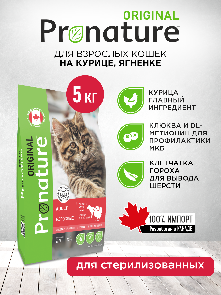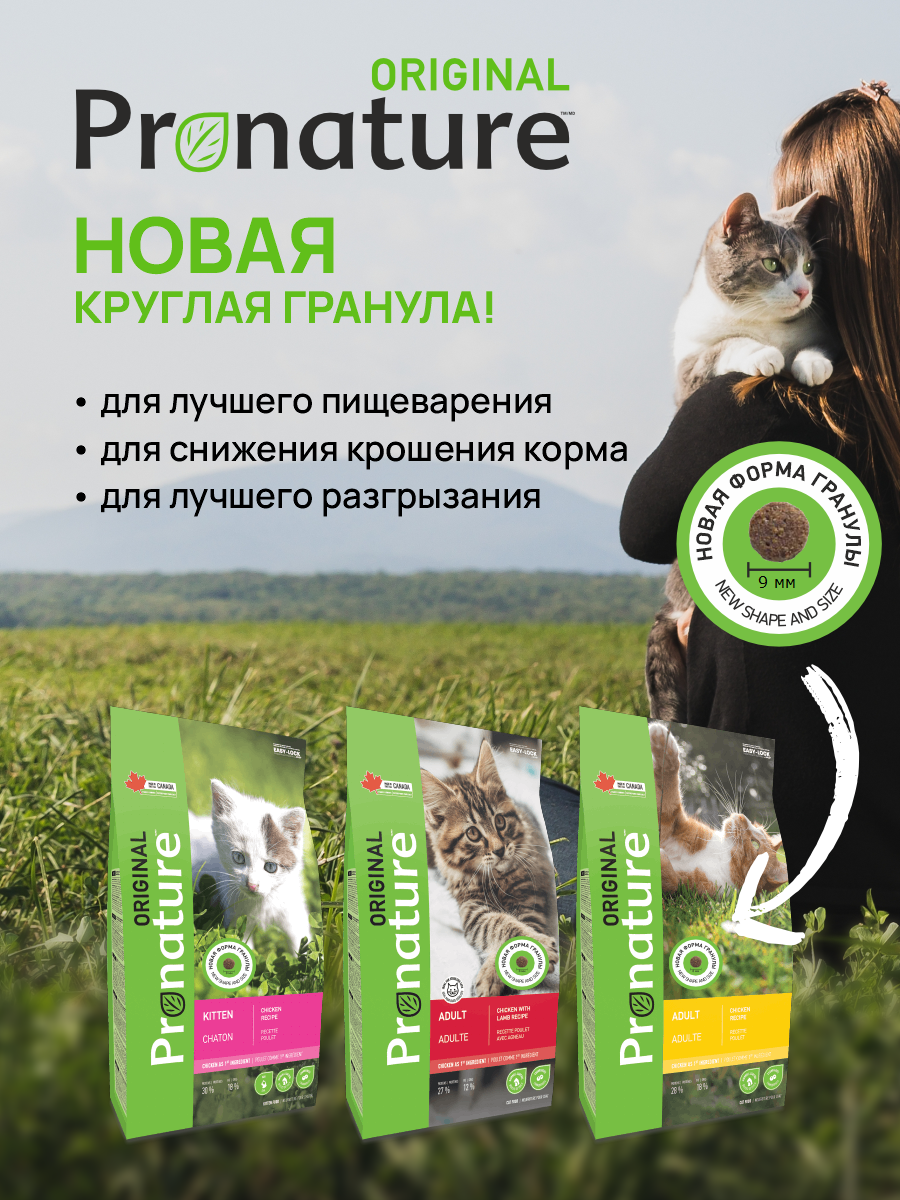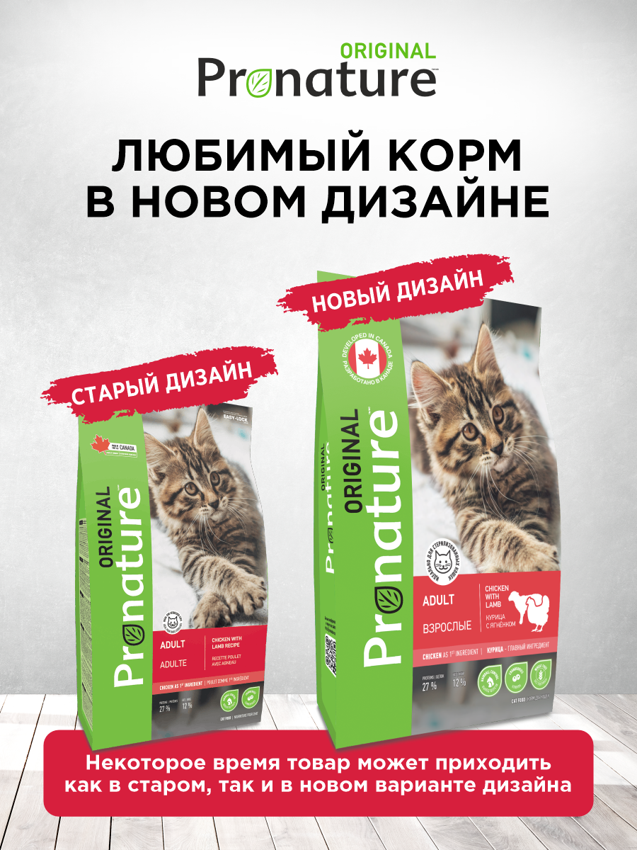 Сухой корм Pronature Original для кошек с курицей и ягненком - это повседневное, сбалансированное питание из высокачественных ингредиентов.