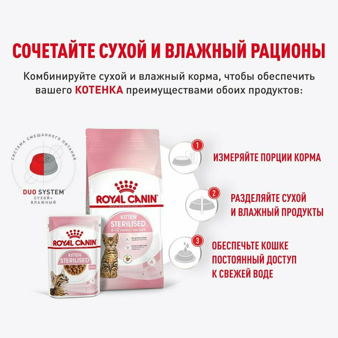 Купить Royal Canin Kitten Sterilised влажный корм для стерилизованных котят в возрасте от 6 до 12 месяцев, мелкие кусочки в соусе, в паучах — 85 г х 28 шт с доставкой по всей России. Royal Canin Kitten Sterilised влажный корм для стерилизованных котят в возрасте от 6 до 12 месяцев, мелкие кусочки в соусе, в паучах — 85 г х 28 шт: сравнение цен, характеристики, фото, актуальное наличие и цены.