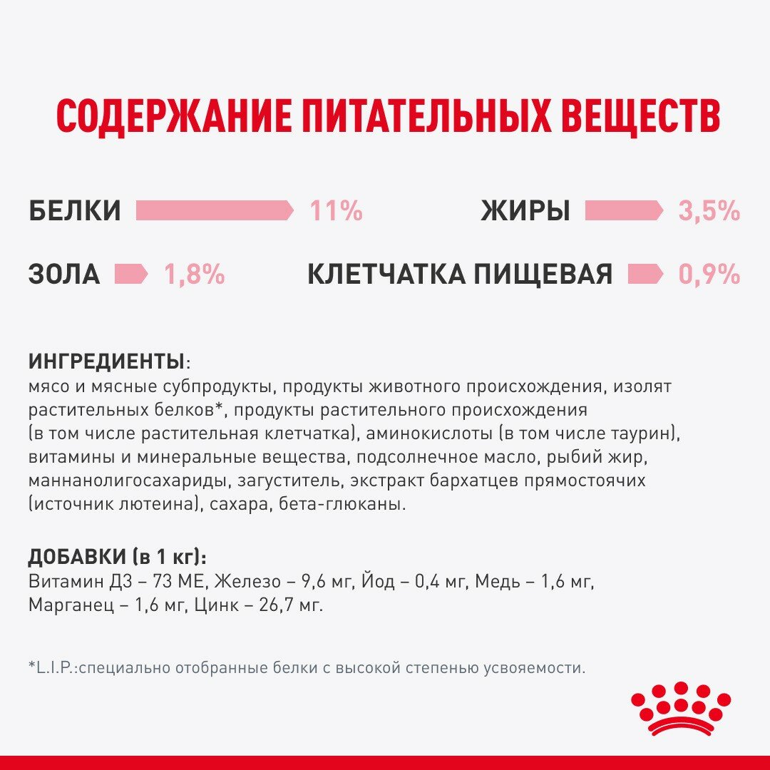 Влажный корм для стерилизованных котят в возрасте от 6 до 12 месяцев Уже через 48 часов после стерилизации у кошки может существенно возрасти аппетит, что приведет к набору избыточного веса. Умеренная калорийность продукта Киттен стерилайзд позволяет избежать набора избыточного веса, а оптимальное количество белков и минеральных веществ поддерживает здоровый рост котенка.