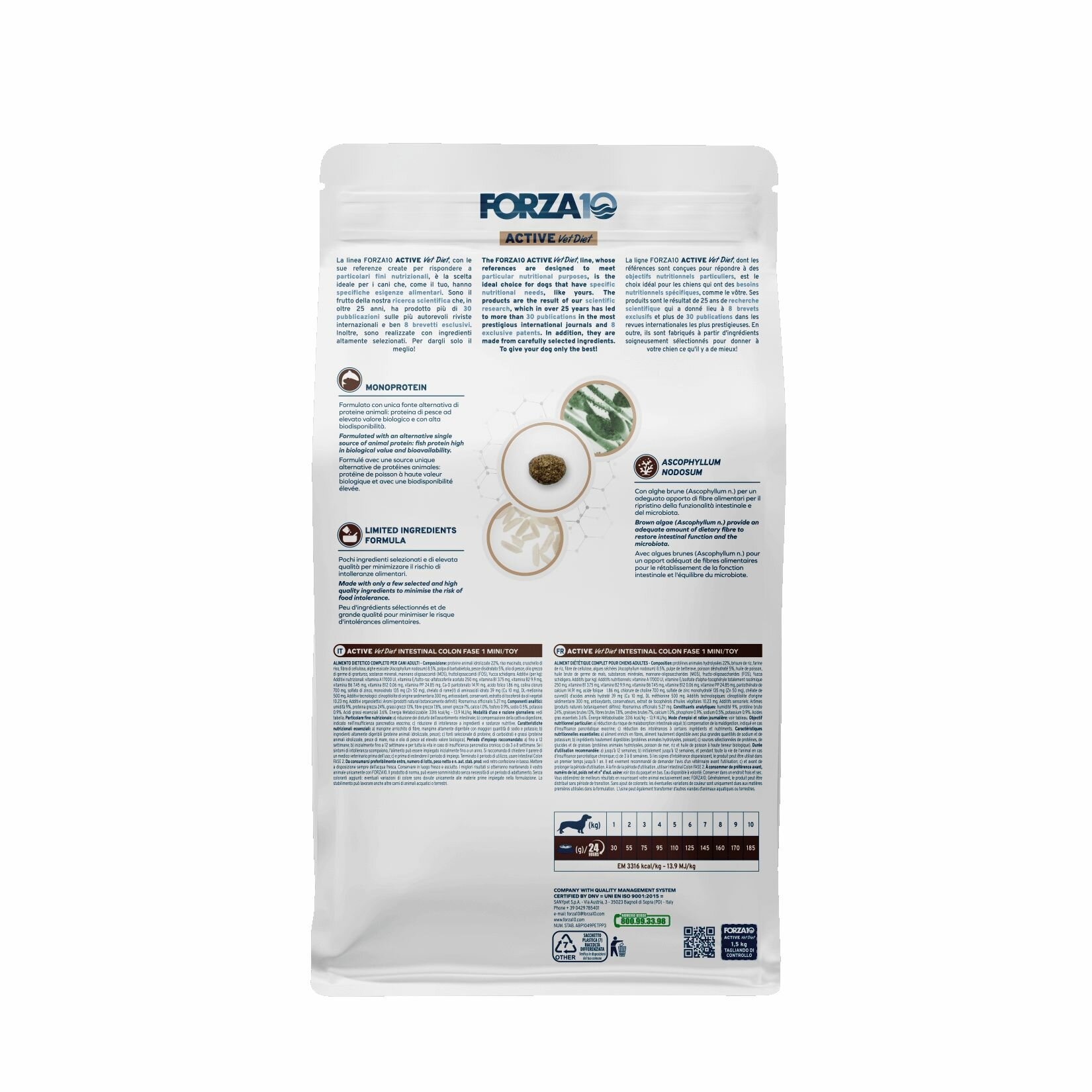 FORZA10 Intestinal Colon фаза 1 диета, созданная доктором Грациано Пенго совместно с научно-исследовательским отделом компании SANYpet. Основным показанием для её применения являются хронические колиты. Использование высококачественных ценных белков, не содержащих токсичные химические и фармакологические загрязнители, в сочетании с высоким содержанием пищевых волокон и электролитов делают этот продукт идеальным для восстановления процессов кишечной адсорбции и для защиты от потери незаменимых макро и микроэлементов. Инновационная формула «Intestinal Colon фаза 1» улучшает естественные защитные механизмы желудочно-кишечного тракта и общее состояние собаки.