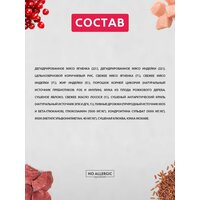 дегидрированное мясо индейки (22%), Цельнозерновой коричневый рис, Свежее мясо ягненка (7%), Свежее мясо индейки (7%), Жир индейки (5%), Порошок корней цикория (натуральный источник пребиотиков: ФОС и инулин), Мука из плодов рожкового дерева, Сушеное яблоко, Свежее масло лосося (1%), Сушеный антарктический криль (натуральный источник ЭПК и ДГК кислот, 1%), Пивные дрожжи (натуральный источник MOS), Глюкозамин (1500 мг/кг), Хондроитин сульфат (1000 мг/кг), MSM (метилсульфонилметан, 40 мг/кг), Сушеная клюква, Юкка Мохаве. Кроме заявленных в составе животных ингредиентов продукт может содержать следы ДНК других ингредиентов животного или растительного происхождения в незначительных количествах из-за технологических особенностей производства кормов.