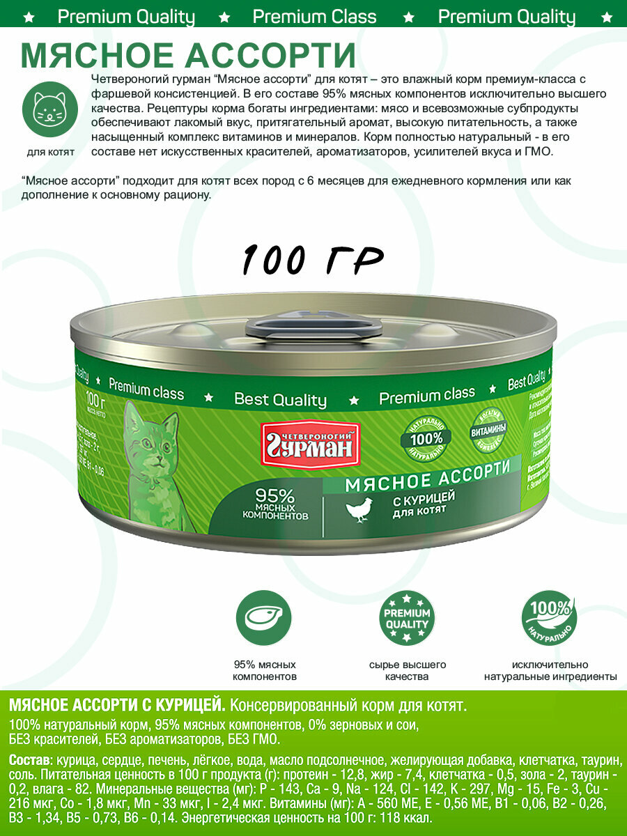 Четвероногий гурман “Мясное ассорти” для котят – это влажный корм премиум класса с фаршевой консистенцией. В его составе 95% мясных компонентов исключительно высшего качества. Рецептуры корма богаты ингредиентами – мясо и всевозможные субпродукты обеспечивают лакомый вкус, притягательный аромат, высокую питательность, а также насыщенный комплекс витаминов и минералов. Корм полностью натуральный – в его составе нет искусственных красителей, ароматизаторов, усилителей вкуса и ГМО.