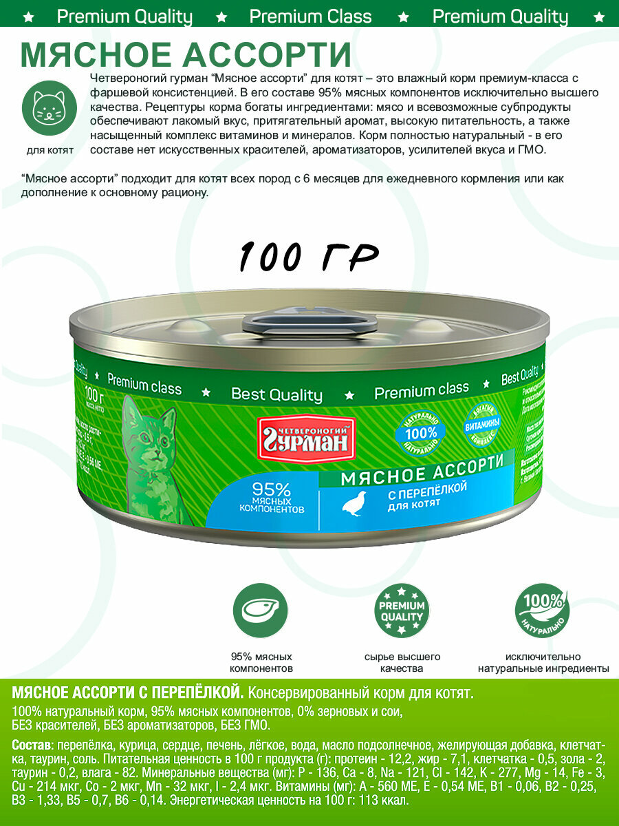 Четвероногий гурман “Мясное ассорти” для котят – это влажный корм премиум класса с фаршевой консистенцией. В его составе 95% мясных компонентов исключительно высшего качества. Рецептуры корма богаты ингредиентами – мясо и всевозможные субпродукты обеспечивают лакомый вкус, притягательный аромат, высокую питательность, а также насыщенный комплекс витаминов и минералов.