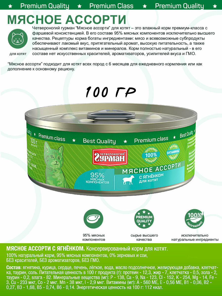 Четвероногий гурман “Мясное ассорти” для котят – это влажный корм премиум класса с фаршевой консистенцией. В его составе 95% мясных компонентов исключительно высшего качества. Рецептуры корма богаты ингредиентами – мясо и всевозможные субпродукты обеспечивают лакомый вкус, притягательный аромат, высокую питательность, а также насыщенный комплекс витаминов и минералов. Корм полностью натуральный – в его составе нет искусственных красителей, ароматизаторов, усилителей вкуса и ГМО.