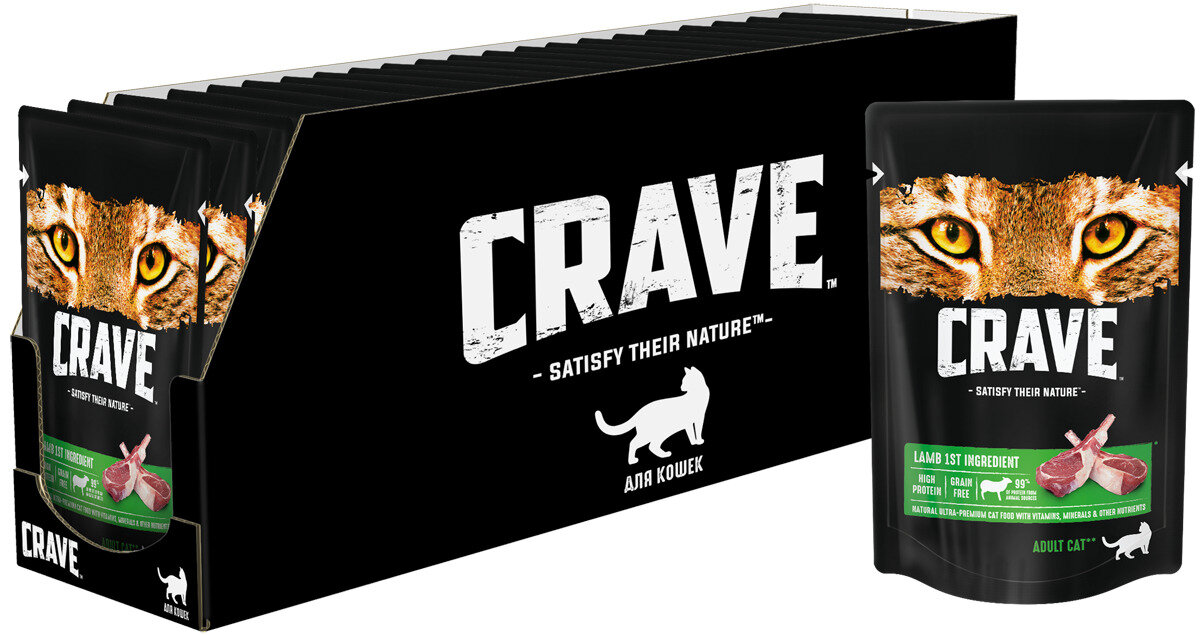 Влажный корм CRAVE для взрослых кошек, содержащий минимум 99% ингредиентов животного происхождения, вдохновлен естественным рационом кошки. Ингредиент № 1 в нем — настоящее мясо. Это придает питомцу энергию, насыщает белком и поддерживает организм в тонусе.