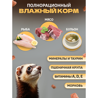 Полноценное питание для хорьков Консервированный корм Ночной охотник разработан специально для хорьков и обеспечивает их всеми необходимыми питательными веществами. В состав входят мясо птицы и субпродукты животного происхождения, а также растительные масла, злаки и минеральные вещества.