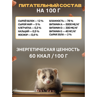 Энергетическая ценность и пищевая ценность Корм Ночной охотник имеет энергетическую ценность 83 кКал/100гр и содержит 7% сырого белка, 3.5% сырого жира, 0.4% сырой клетчатки, 0.25% кальция и 0.3% фосфора.