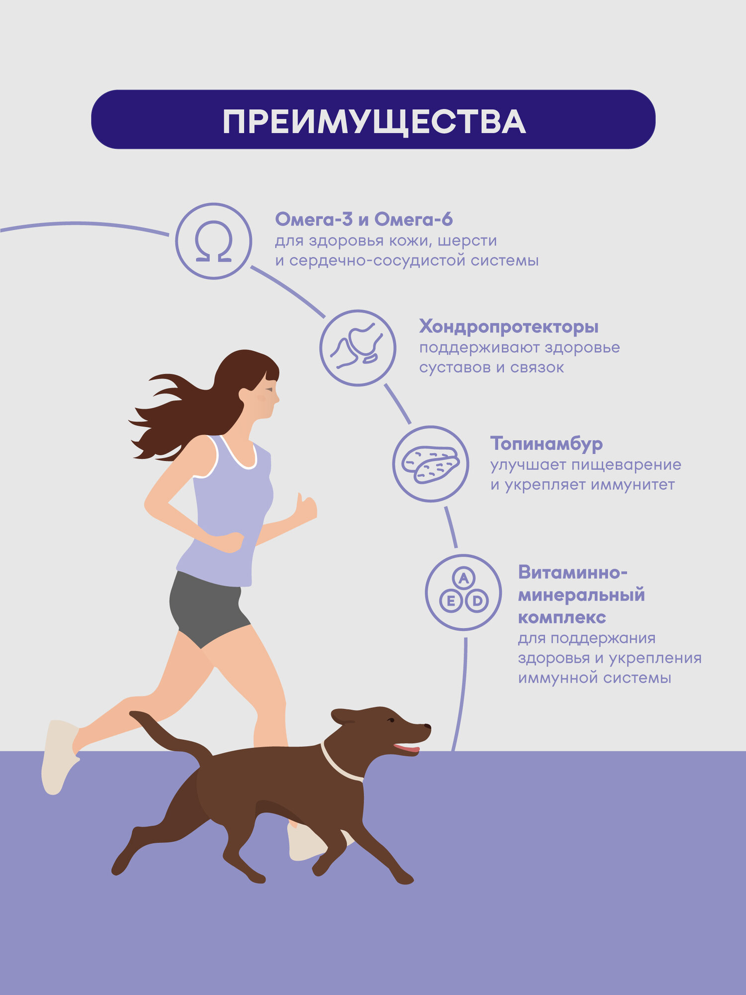 В составе корма также присутствуют хондропротекторы, которые способствуют здоровью суставов и костей. Топинамбур, входящий в состав, укрепляет иммунную систему, а ОМЕГА-3 и ОМЕГА-6 способствуют правильному развитию сердечной системы.