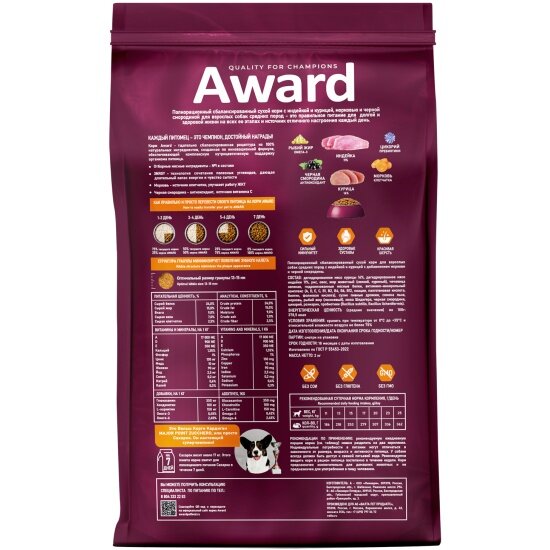 Сухой корм для взрослых собак средних пород Award с индейкой и курицей - это сбалансированный и питательный рацион, разработанный специально для поддержания здоровья и активности вашего питомца.