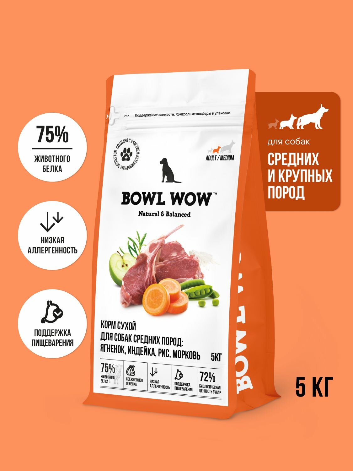 Полнорационный сухой корм для взрослых собак средних пород с ягненком, индейкой, рисом и морковью BOWL WOW — это формула со свежим бескостным мясом и полезными субпродуктами. Помимо сбалансированных белков, жиров, углеводов, витаминов и микроэлементов, в состав входят комплексы поддержки чувствительного пищеварения и иммунной системы. Размер гранул 12–14 мм идеально подходит для взрослых собак средних пород (от 10 до 25 кг).