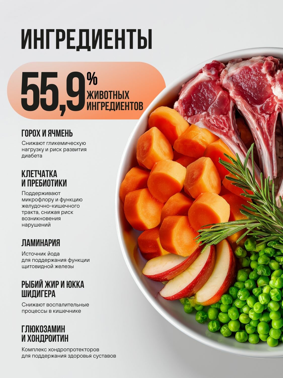 - Горох и цельный ячмень в составе формулы обладают низким гликемическим индексом, что позволяет контролировать уровень сахара в крови и способствует профилактике диабета. Это особенно важно для животных с избыточным весом.