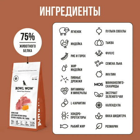 Корм сухой полнорационный BOWL WOW для взрослых собак мелких пород с ягненком, индейкой, рисом и добавлением тыквы 800гр.: сравнение цен, характеристики, фото, актуальное наличие и цены.