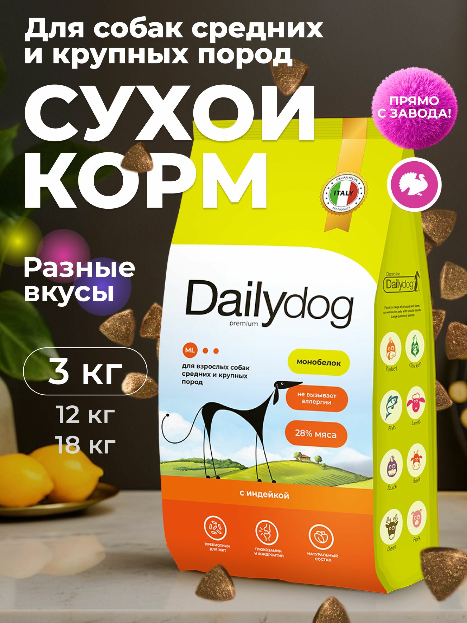 Корм сухой Dailydog для собак средних и крупных пород, с индейкой, 3 кг: сравнение цен, характеристики, фото, актуальное наличие и цены.