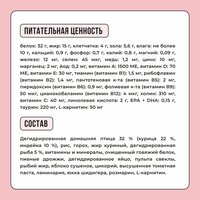 Высокое содержание животного белка в составе — 71%. Этот показатель рассчитан ветеринарными диетологами и позволяет обеспечивать организм кошки необходимыми аминокислотами без избыточной нагрузки на почки.
