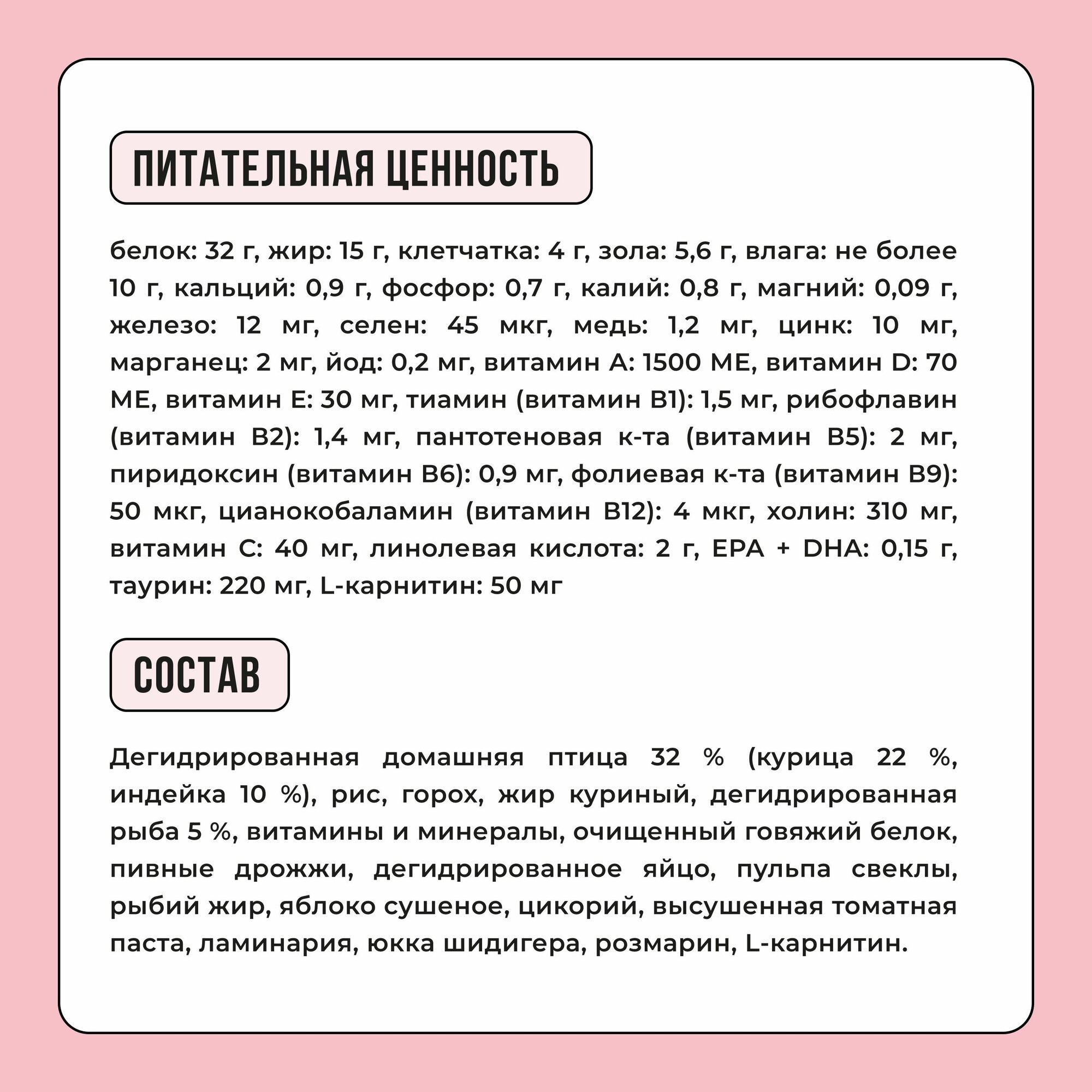 Соответствие международным нормам по кормам FEDIAF и российскому госту Р 55453-2022.