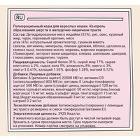 В его состав входит свежее мясо утки (4%) и дегидрированное мясо индейки (32%). В формулу входят разные виды клетчатки, которые помогают шерсти естественным образом выходить из организма, что предотвращает проблемы с желудочно-кишечным трактом.