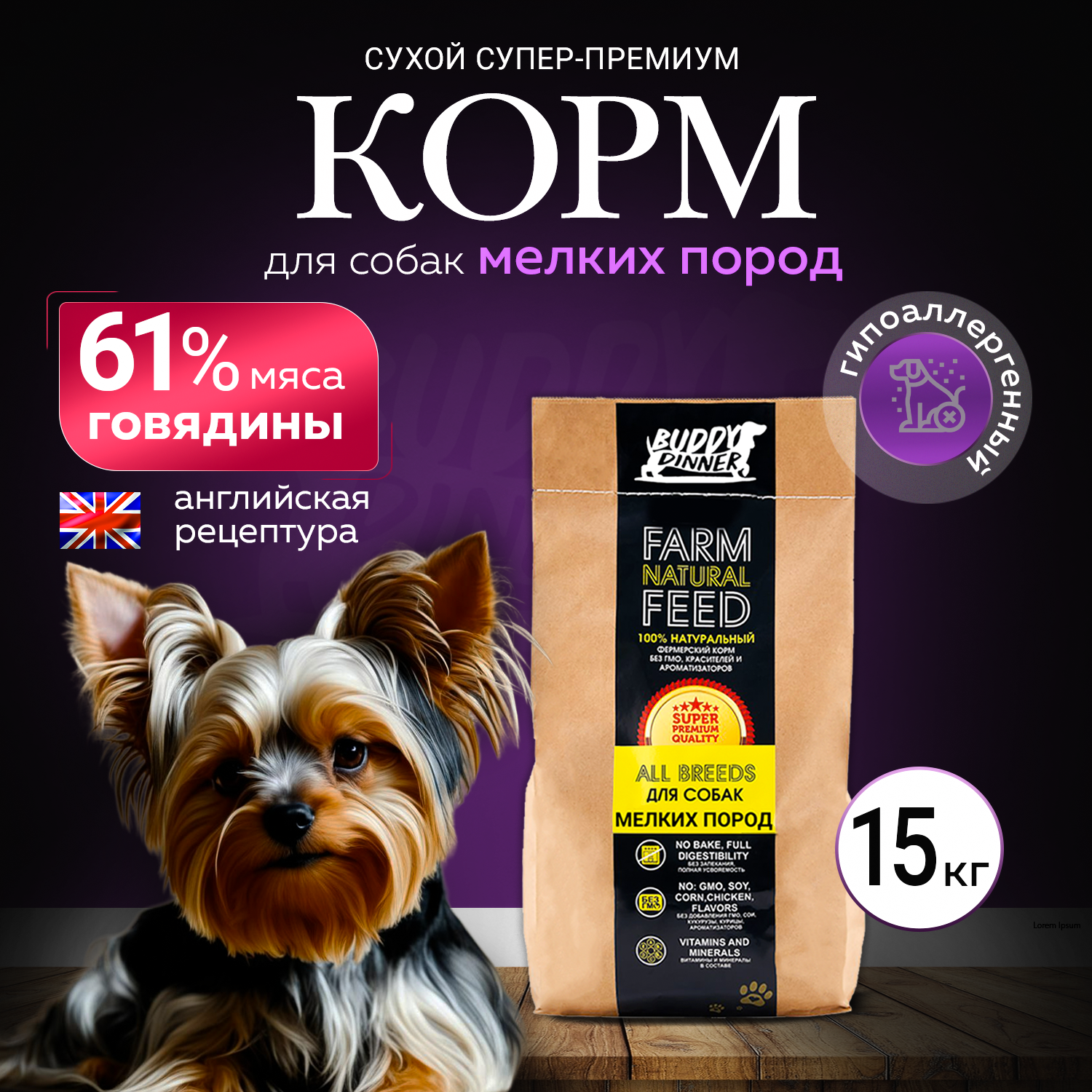 Натуральный полнорационный собачий гипоаллергенный корм с говядиной BUDDY DINNER супер премиум . Корм сухой для собак 15 кг имеет 100% натуральный состав с высоким содержанием мяса, без вкусовых добавок, ароматизаторов, красителей, сои, кукурузы, глютена и курицы.
