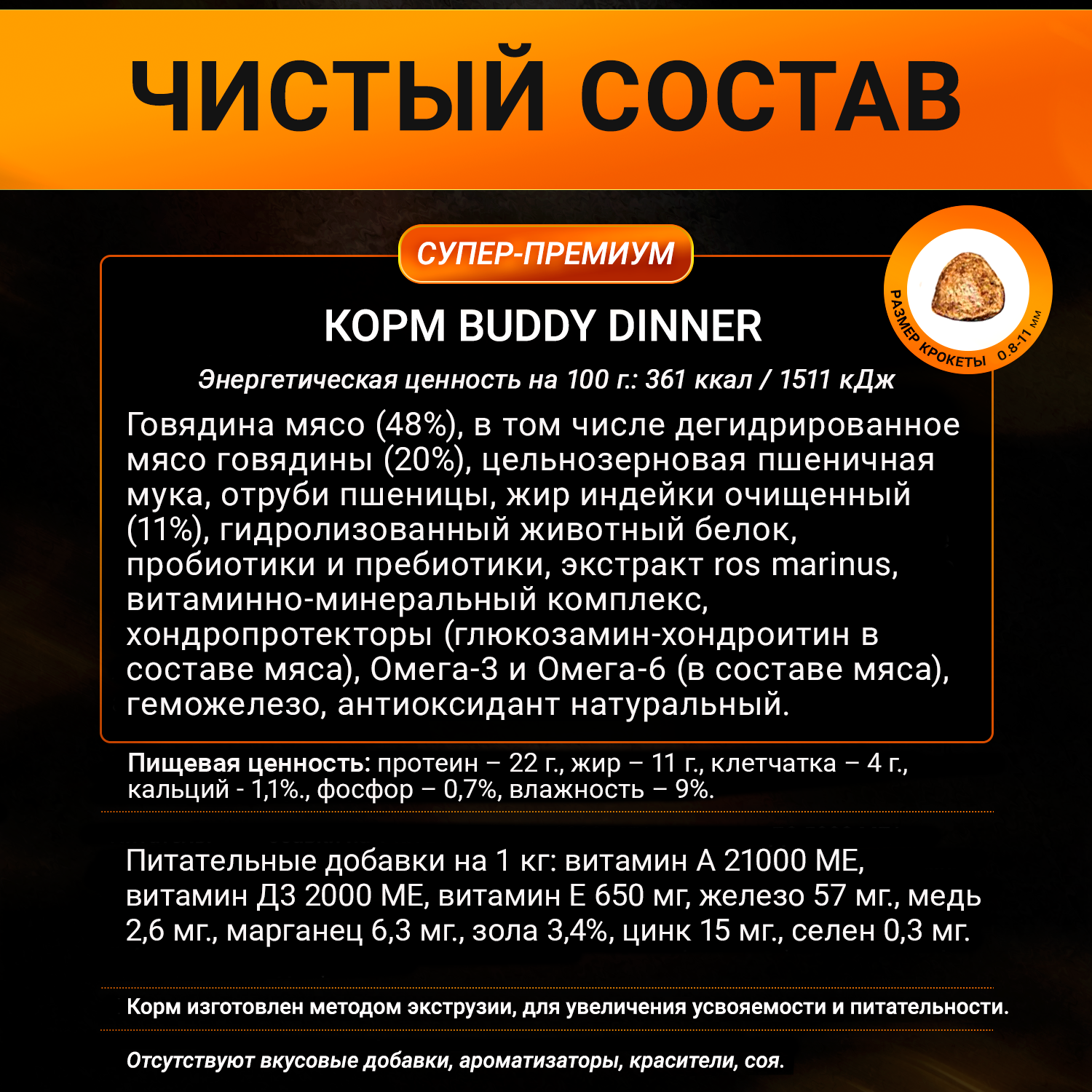 Сухой корм для собак Buddy Dinner является идеальным выбором для тех, кто хочет обеспечить своего питомца сбалансированным и полноценным рационом. Корм изготовлен методом экструзии, чтобы увеличить усвояемость и питательность. Этот инновационный процесс обеспечивает усвоение корма на 99%, что означает, что ваш питомец получает максимальную пользу от каждого глотка. Благодаря этому корму, шерсть вашей собаки станет более блестящей, и вы заметите, что она перестает выпадать. Большой процент мяса в составе Buddy Dinner обеспечивает вашего питомца запахом и вкусом натурального мяса, которого он так обожает.