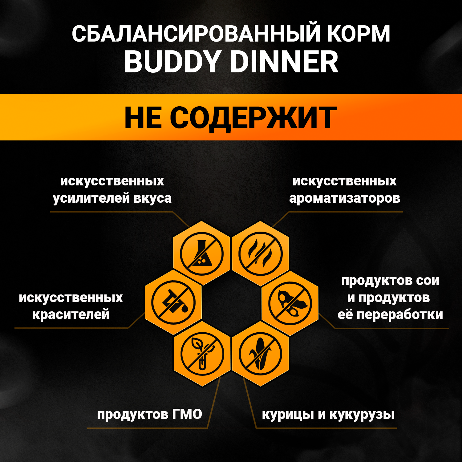 Одним из главных преимуществ Buddy Dinner является его гипоаллергенная формула. Этот корм идеально подходит для собак с аллергией и чувствительным пищеварением. В нем отсутствуют ГМО, соя, курица, кукуруза, искусственные красители, усилители вкуса и ароматизаторы, что минимизирует риск пищевых реакций и обеспечивает максимальную переваримость.