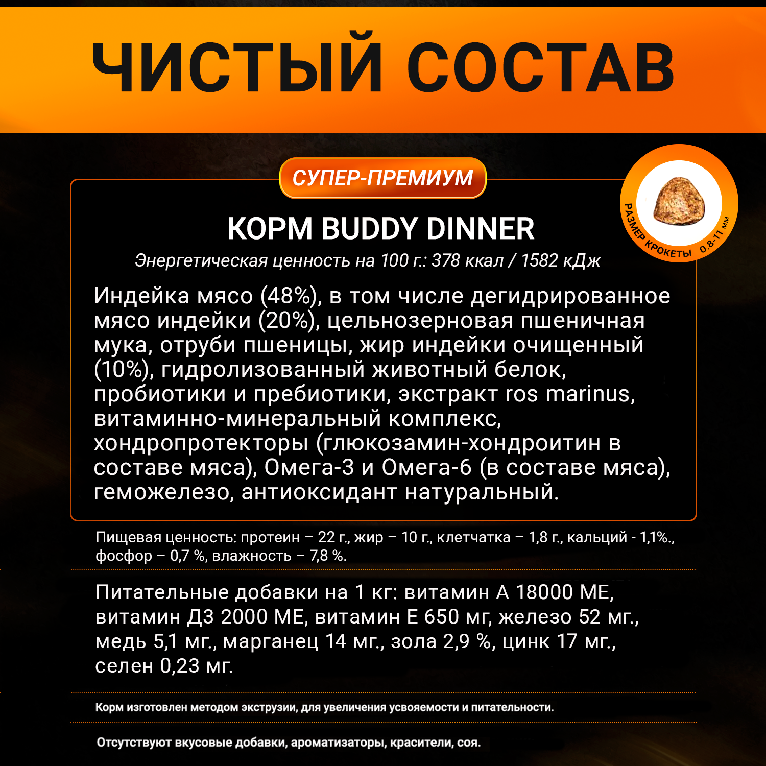 Сухой корм Buddy Dinner Orange Line с индейкой 3 кг - идеальное решение для питания собак мелких пород. Этот корм, рекомендуемый кинологами и ветеринарными врачами, обеспечивает вашего питомца всем необходимым для здоровья и активной жизни.