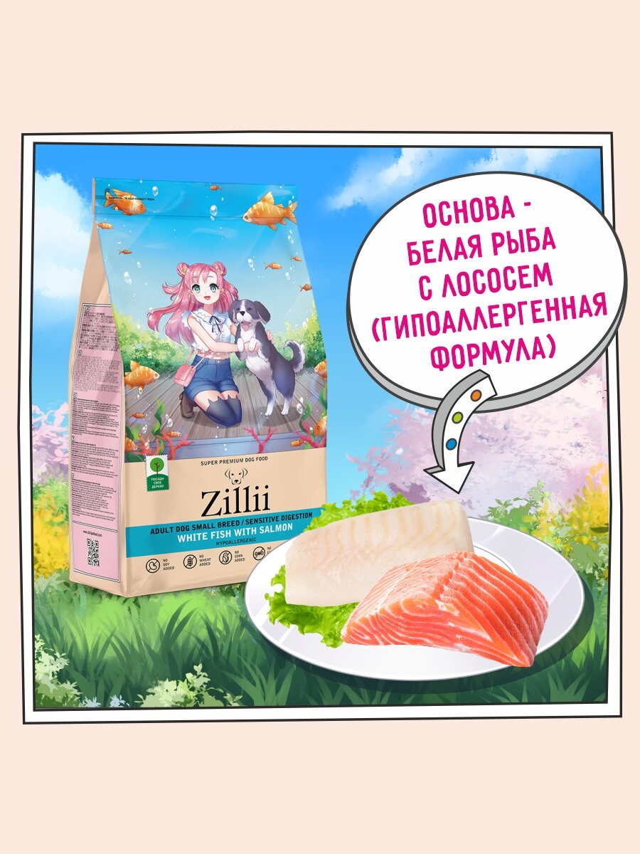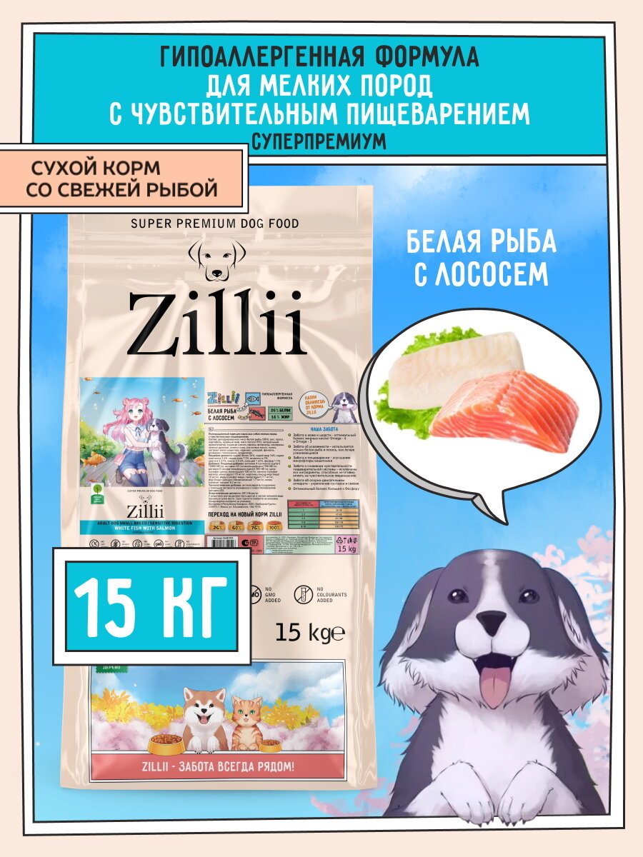 Корм сухой для собак мелких пород с чувствительным пищеварением 15 кг гипоаллергенный ZILLII (Зиллии), Белая Рыба/Лосось