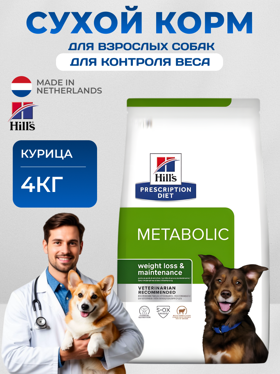 Корм сухой для собак со вкусом курицы Hill’s Prescription Diet Metabolic, 4 кг: сравнение цен, характеристики, фото, актуальное наличие и цены.