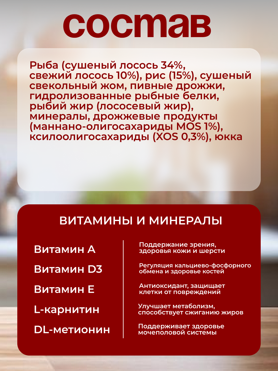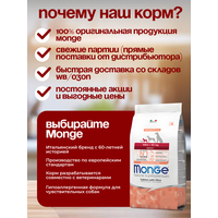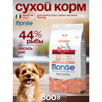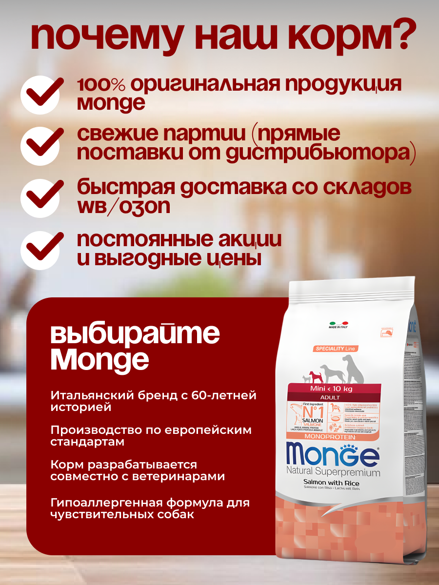 Monge Dog Speciality Mini корм для взрослых собак мелких пород лосось с рисом 800 г Полнорационный корм на основе лосося и риса для взрослых собак всех пород с особыми потребностями. Разработан на основе лосося северного моря, богат Омега-3 и Омега-6 жирными кислотами, которые позволяют предупредить воспалительные процессы и сохранить здоровье кожи и шерсти вашего питомца. Лосось и рис гарантируют правильное усвоение белков и углеводов. Корм прекрасно подходит для собак с проблемами пищеварения и кожными заболеваниями. Данный продукт предназначен для собак с заболеваниями кожи, такими, как дерматит, перхоть, зуд, а также для собак со светлой шерстью. Глюкозамин, хондроитин и МСМ благотворно влияют на здоровье всего костного аппарата, помогают предотвратить возникновение болезней суставов. Ингредиенты: рыба (34 дегидрированного и 10 свежего лосося), рис, сухая свекольная пульпа, пивные дрожжи (источник МОС и витамина B12), гидролизованный белок рыбы, рыбий жир (масло лосося, консервированный с помощью натуральных антиоксидантов), карбонат кальция, гидролизованные хрящи (источник хондроитина сульфата), гидролизованные ракообразные (источникглюкозамина), метилсульфонилметан, КОС (ксилоолигосахариды 3г/кг), гидролизованные дрожжи (источник МОС), юкка Шидигера, спирулина, корень эхинацеи, орегано, порошок сушеного чеснока. Индивидуальная непереносимостьРекомендации по кормлению: корм можно подавать сухим или размоченным теплой водой. Суточная норма может варьироваться в зависимости от индивидуальных потребностей животного. Важно, чтобы у животного всегда был доступ к свежей питьевой воде. Информация с сайта производителяАнализ компонентов: сырой белок 25,00 , сырые масла и жиры 14,00 , сырая клетчатка 2,50 , сырая зола 6,50 , кальций 1,20 , фосфор 0,90 , омега-6 жирные кислоты 4,00 , омега-3 жирные кислоты 0,30 . Пищевые добавки/кг: витамин А 24000 МЕ, витамин D3 1700 МЕ, витамин Е 190 мг, витамин В1 12 мг, витамин В2 15 мг, витамин В6 7 мг, витамин В12 150 мг, биотин 20 мг, ниацин 30 мг, витамин С 200 мг, пантотеновая кислота 18 мг, фолиевая кислота 1,70 мг, холина хлорид 2500 мг, инозитол 3,60 мг, Е5 сульфат марганца моногидрат 32 мг, Е6 оксид цинка 150 мг, Е4 сульфат меди пентагидрат 13 мг, Е1 сульфат железа моногидрат 110 мг, Е8 селенит натрия 0,20 мг, Е2 йодат кальция 1,80 мг, L-карнитин 100 мг, DL-метионин 1,60г. Технологические добавки/кг: натуральная смесь из токоферола и экстракта розмарина обыкновенного. Органолептические добавки/кг: натуральный экстракт каштана 20 мг, экстракт артишока 300 мг. Энергетическая ценность: 4 020 ккал/кг.