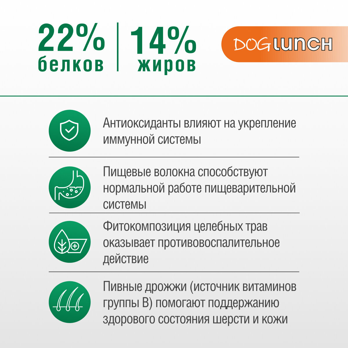 Состав: продукты переработки мяса (дегидратированное мясо говядины, куриная мука, мясная мука), зерновые культуры и продукты их переработки (в том числе рисовая мука), кукурузный глютен, гидролизированные мясные белки, животный жир, подсолнечное масло, высушаная мякоть сахарной свеклы (источник пищевых волокон), пивные дрожжи (сточник витаминов группы В), фитокомпозияиция (ромашка, календула), минеральные вещества, витамины, антиоксидант.