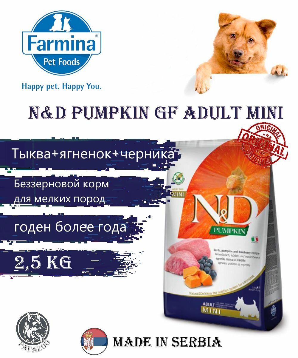Купить Корм сухой Farmina N&D беззерновой д/взр собак мелких пород с ягненком, черникой и тыквой, 2,5 кг с доставкой по всей России. Корм сухой Farmina N&D беззерновой д/взр собак мелких пород с ягненком, черникой и тыквой, 2,5 кг: сравнение цен, характеристики, фото, актуальное наличие и цены.