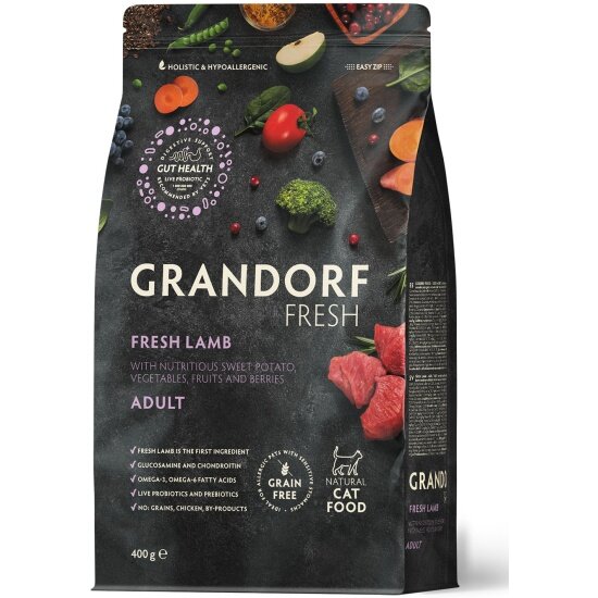 Купить Grandorf Fresh Cat Adult Lamb&Sweet Potato сухой беззерновой корм с живыми пробиотиками для взрослых кошек с ягненком и бататом — 400 г с доставкой по всей России.